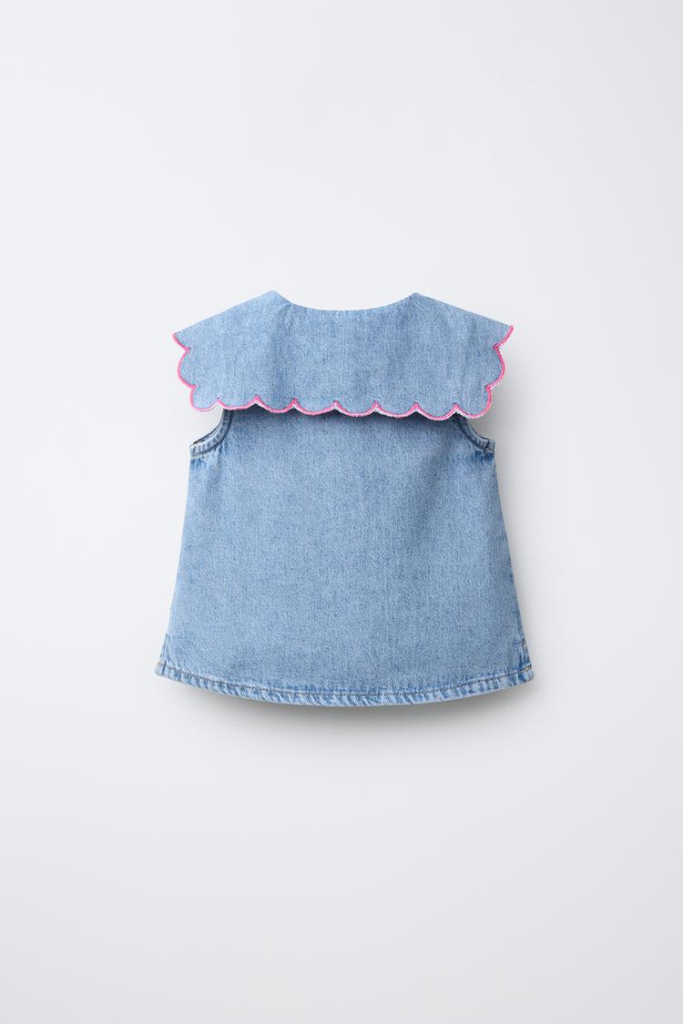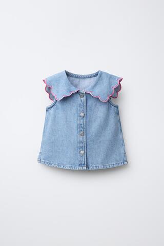 Джинсовый топ без рукавов с круглым воротником. Застегивается на кнопки спереди. Волнистый край на воротнике.
