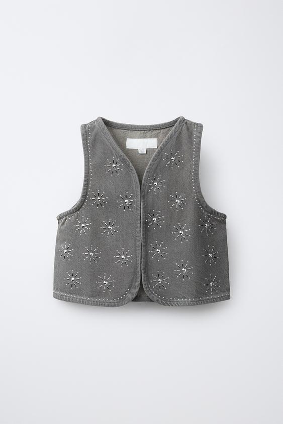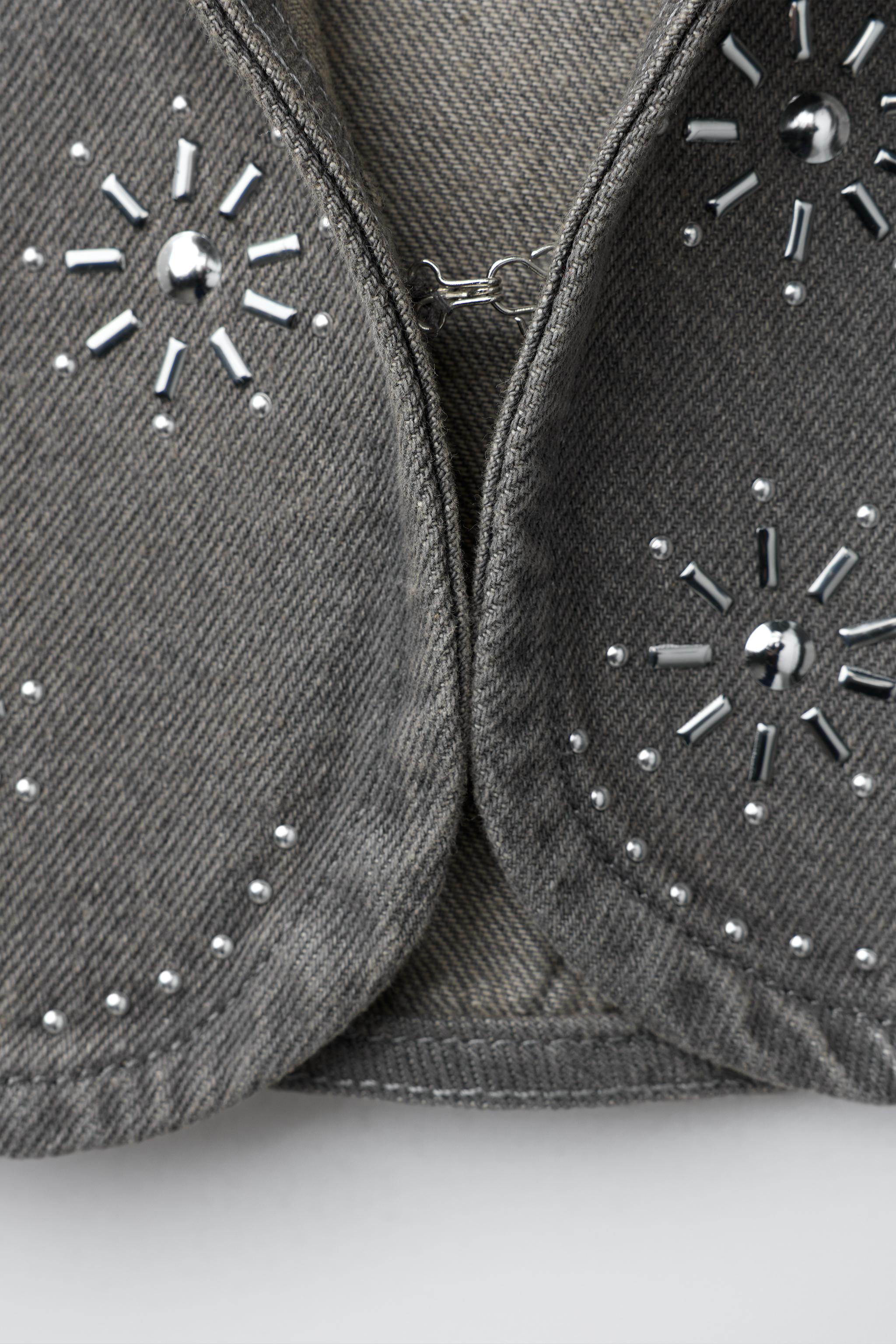 ZARA ДЖИНСОВЫЙ ЖИЛЕТ СО СТРАЗАМИ, АНТРАЦИТОВО-СЕРЫЙ