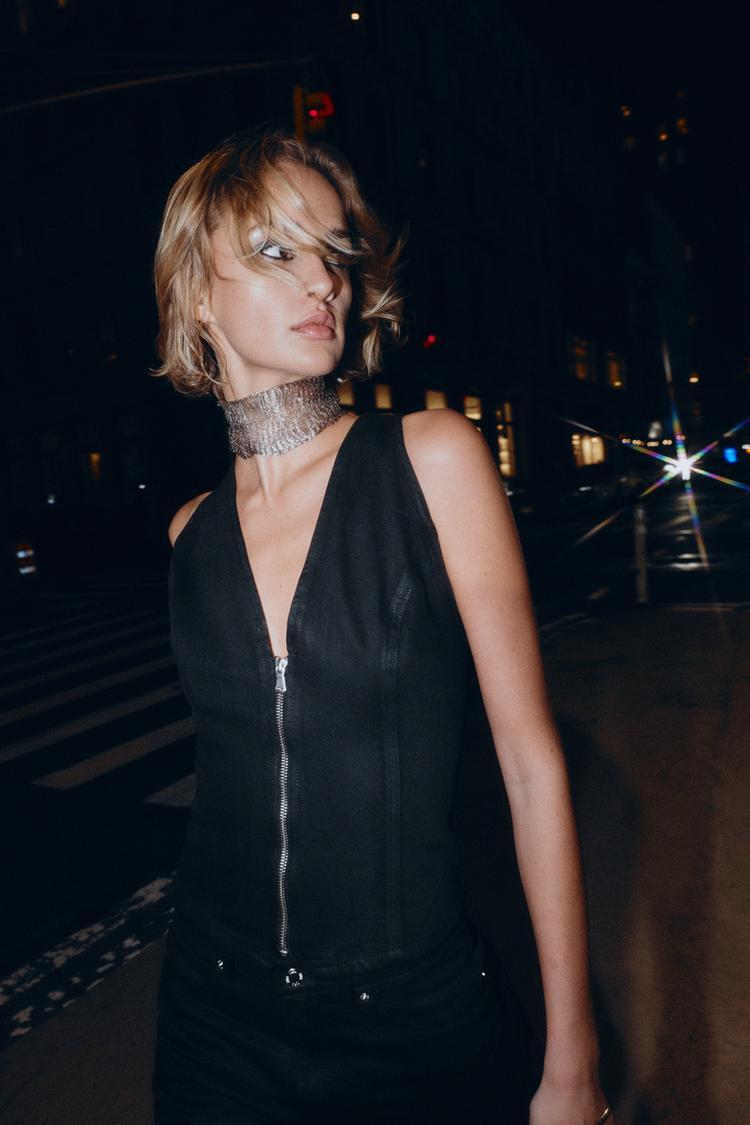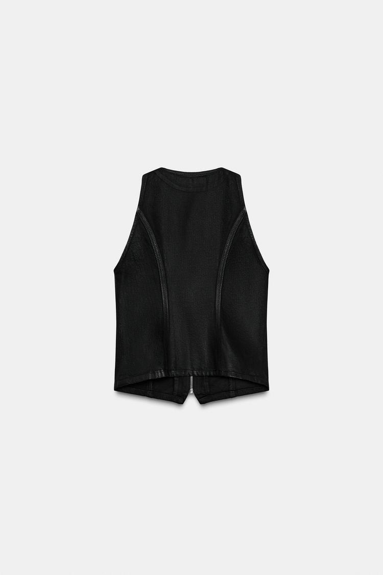 Жилет с воротником халтер и V-образным вырезом. Детали из ткани с эффектом вощения. Застежка на молнию спереди.
