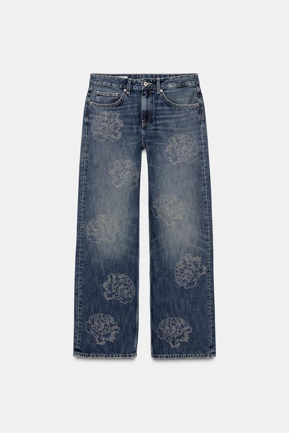 ZARA ДЖИНСЫ BARREL TRF С ВЫСОКОЙ ПОСАДКОЙ И ЦВЕТОЧНЫМ ПРИНТОМ, СИНИЙ