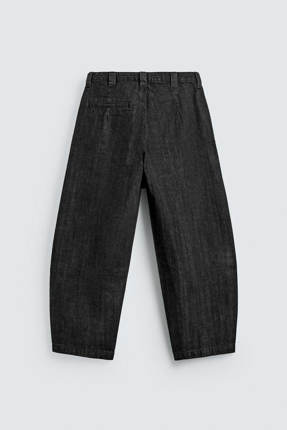 Джинсы объемного кроя barrel fit из нестираного хлопка. Вначале они кажутся жесткими, но со временем ткань становится мягче. Свободный крой в области бедер и бедер, с изогнутой формой, сужающейся к щиколотке. Средняя посадка. Плотная ткань. Пояс с декоративными складками спереди. Передние прорезные карманы и задние прорезные карманы. Застежка-молния и потайной металлический крючок.