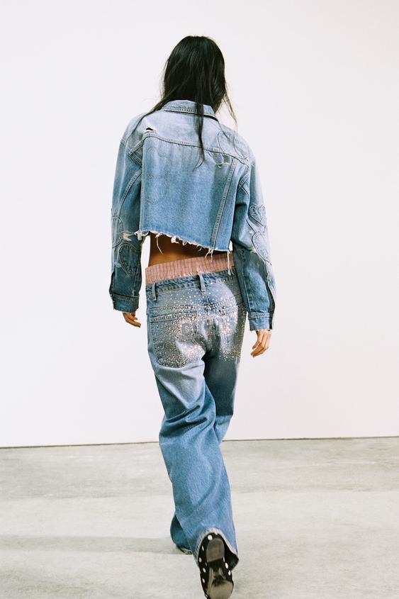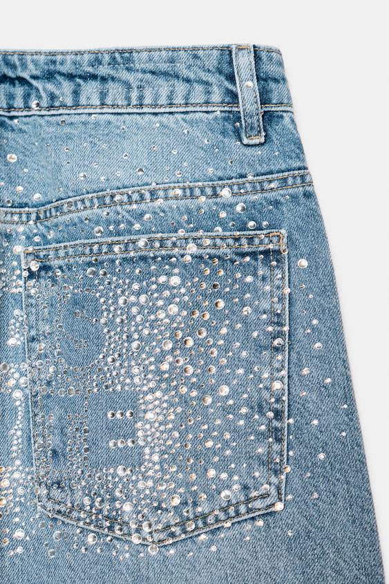 ZARA ДЖИНСЫ ПРЯМОГО КРОЯ СО СТРАЗАМИ И СРЕДНЕЙ ПОСАДКОЙ, СИНИЙ