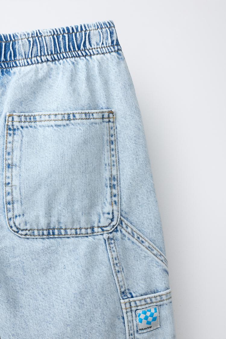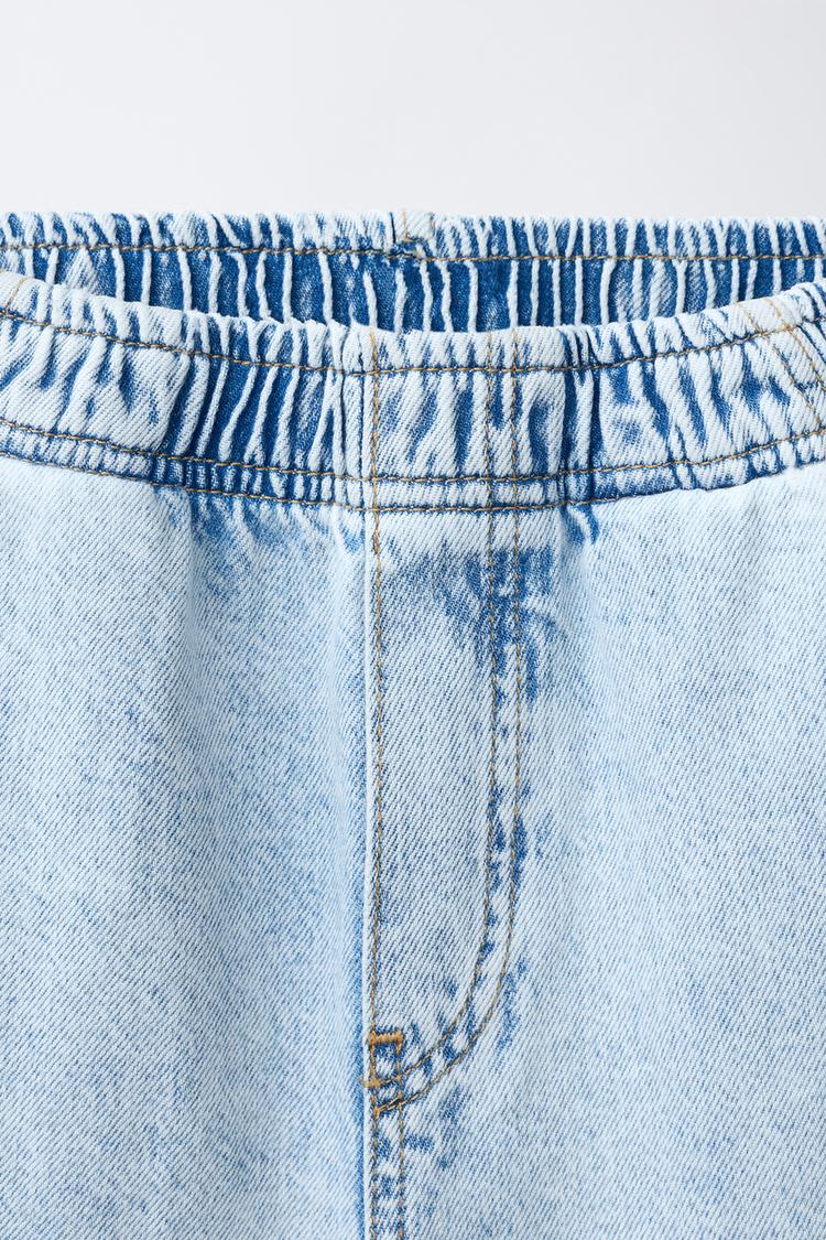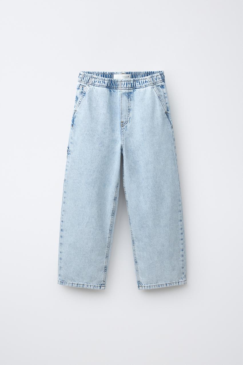 Джинсы свободного кроя с эластичным поясом. Передние карманы и задние накладные карманы.
