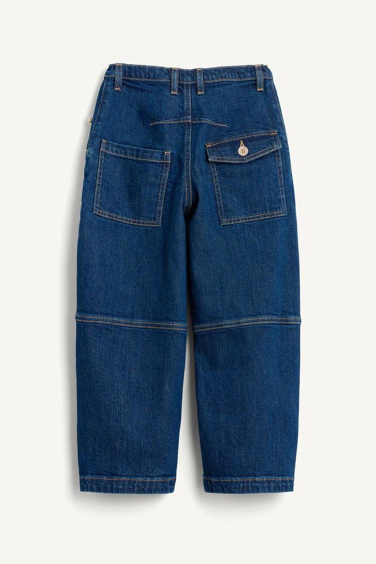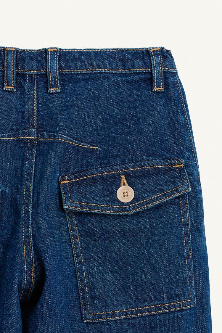 Джинсы с регулируемым поясом, застежкой спереди на пуговицах, с поясной перемычкой. С карманами с детализацией на петлях спереди и накладными карманами сзади.