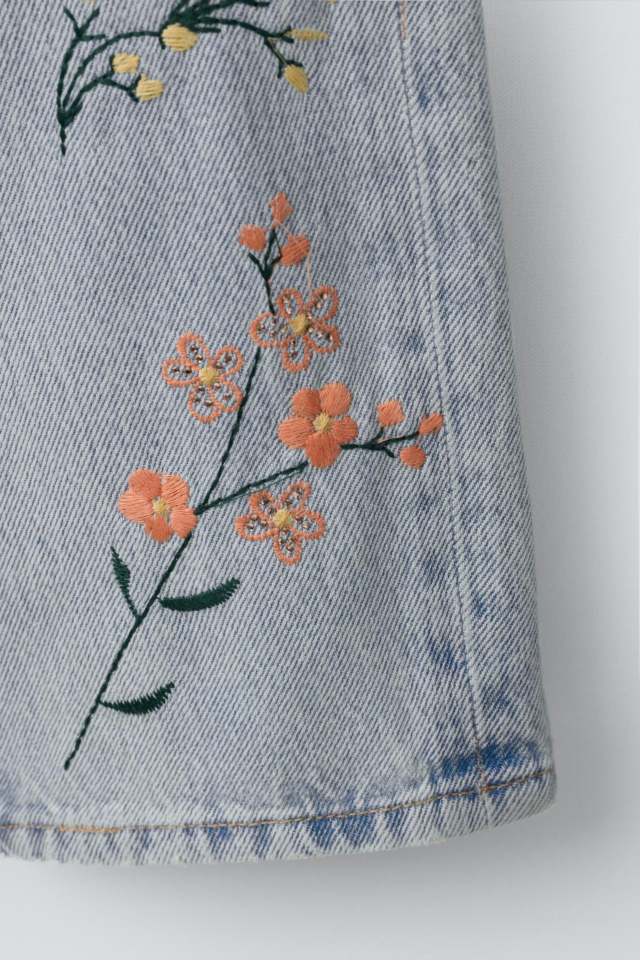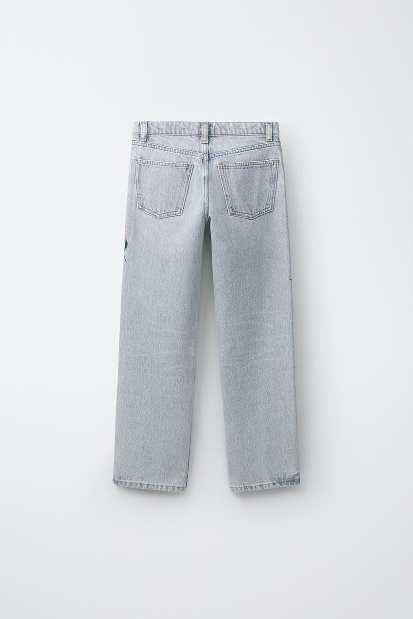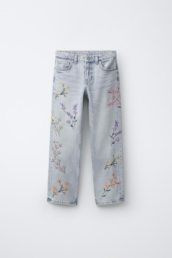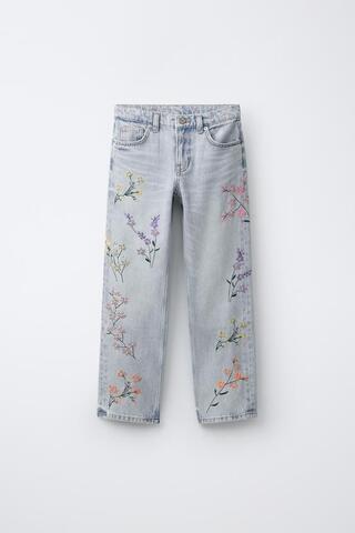 ZARA ДЖИНСЫ STRAIGHT С ВЫШИВКОЙ ЦВЕТОВ, СИНИЙ