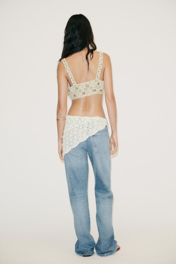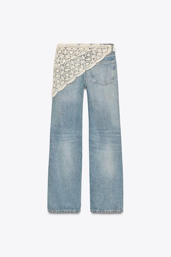 ZARA ДЖИНСЫ TRF WIDE-LEG СО СРЕДНЕЙ ПОСАДКОЙ И ВЯЗАНОЙ ДЕТАЛЬЮ, СИНИЙ