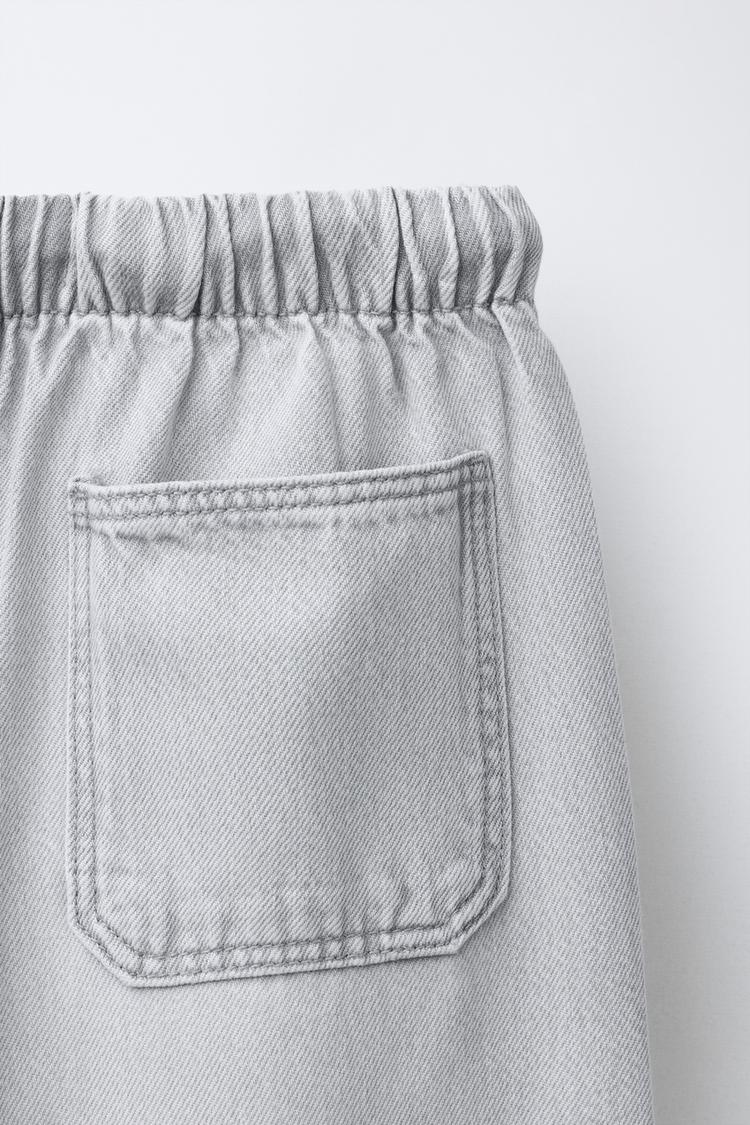 Джинсы широкого кроя с эластичным поясом и регулируемыми шнурками спереди. Передние карманы и накладные карманы сзади.