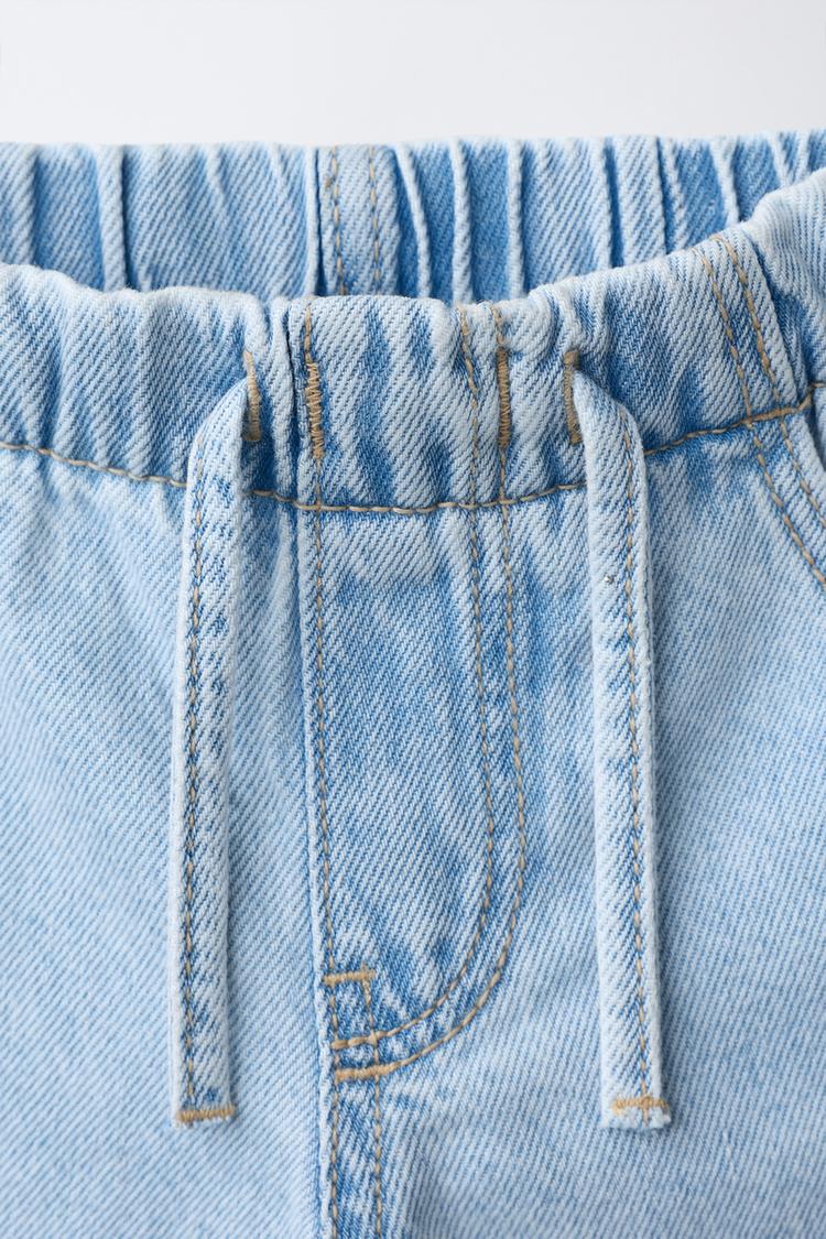 Джинсы широкого кроя с эластичным поясом и декоративными шнурками спереди. Карманы спереди и накладные карманы сзади. С разрезами.