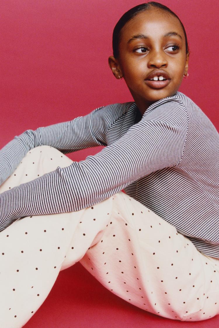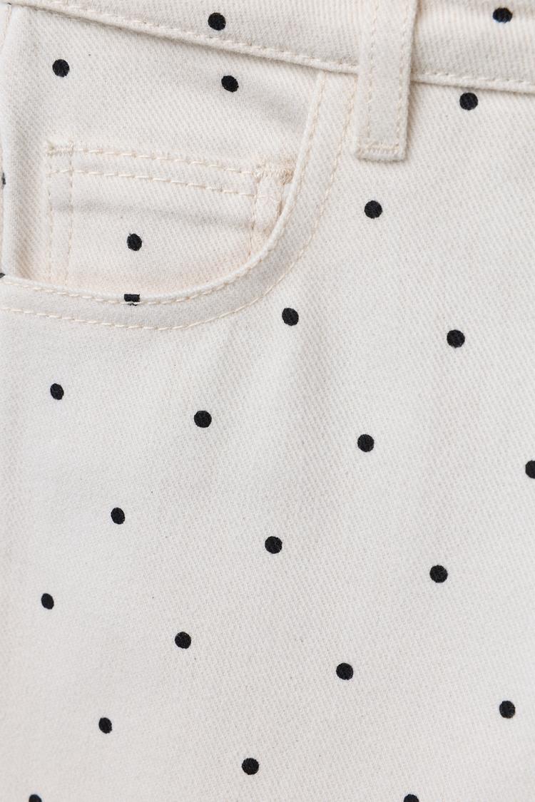 Джинсы с широкими штанинами. Регулируемый с внутренней стороны пояс, застежка на пуговицу. Передние карманы и задние накладные карманы. Принт в горошек.