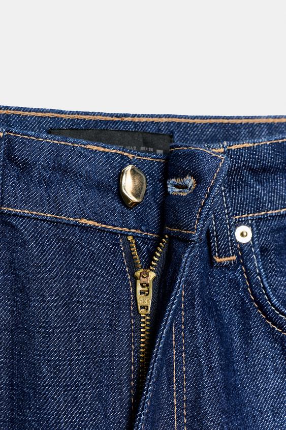 Джинсы с высокой посадкой и пятью карманами. Прямые штанины с отглаженными стрелками спереди и сзади. Застежка-молния и пуговица спереди.