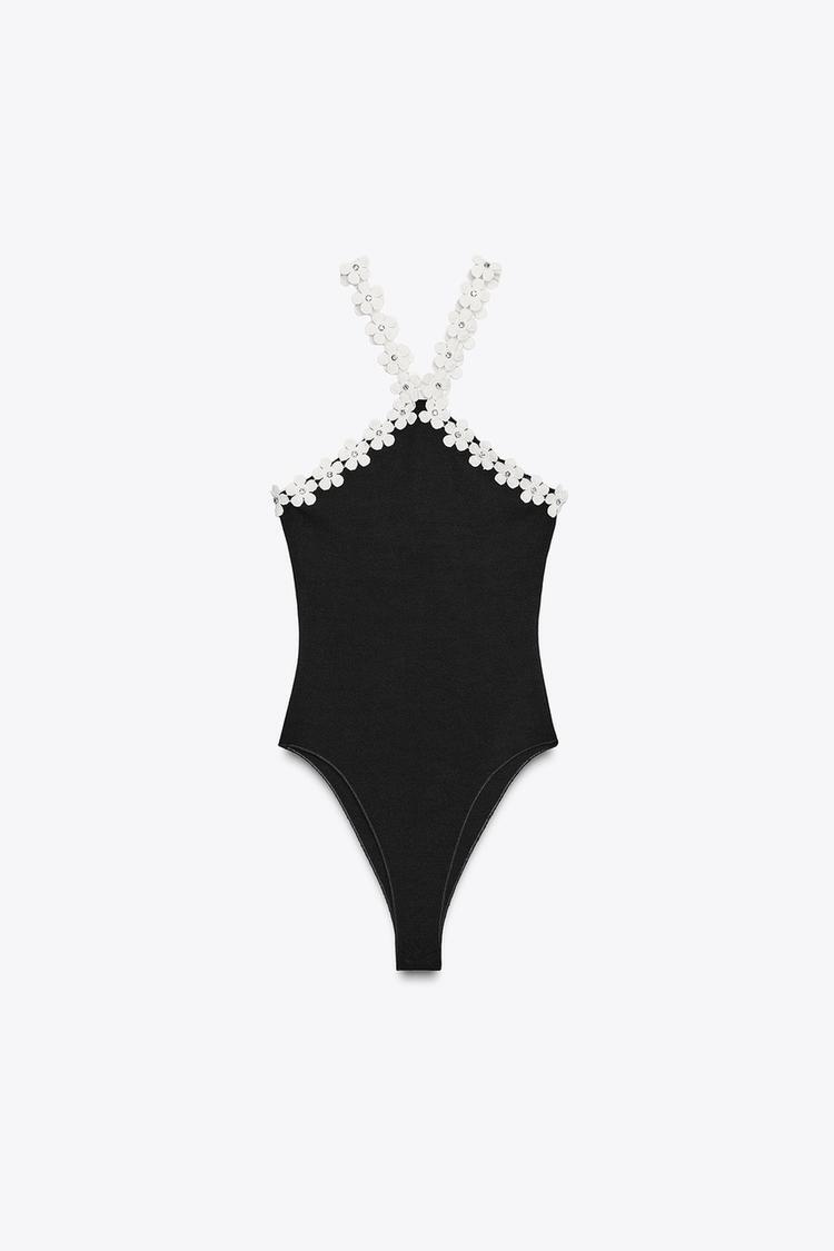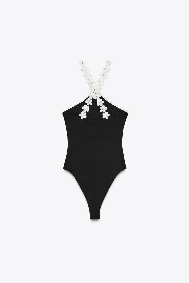 ZARA ЭЛАСТИЧНОЕ БОДИ С ЦВЕТОЧНОЙ ФУРНИТУРОЙ, ЧЕРНЫЙ