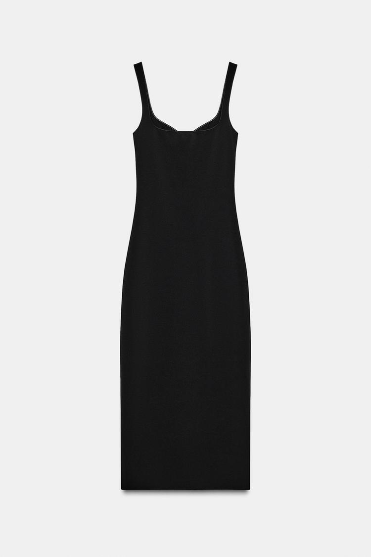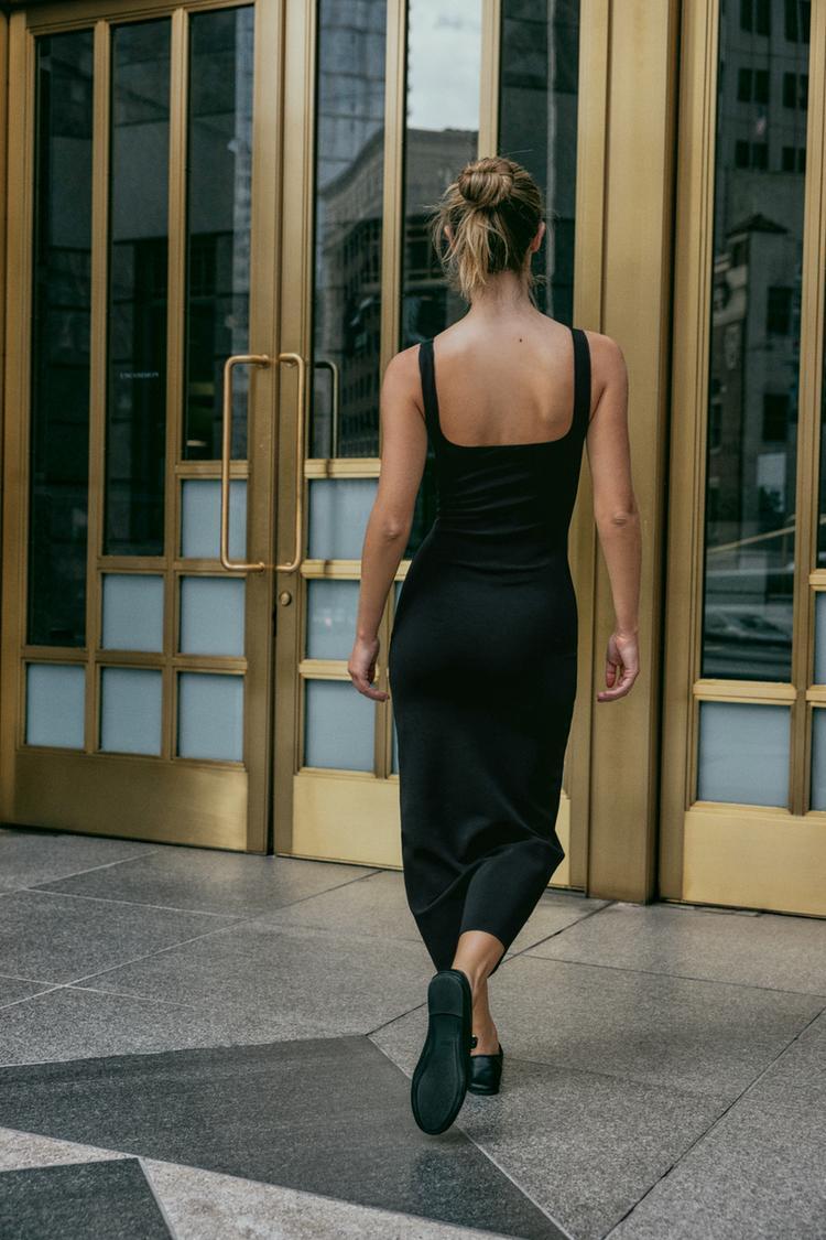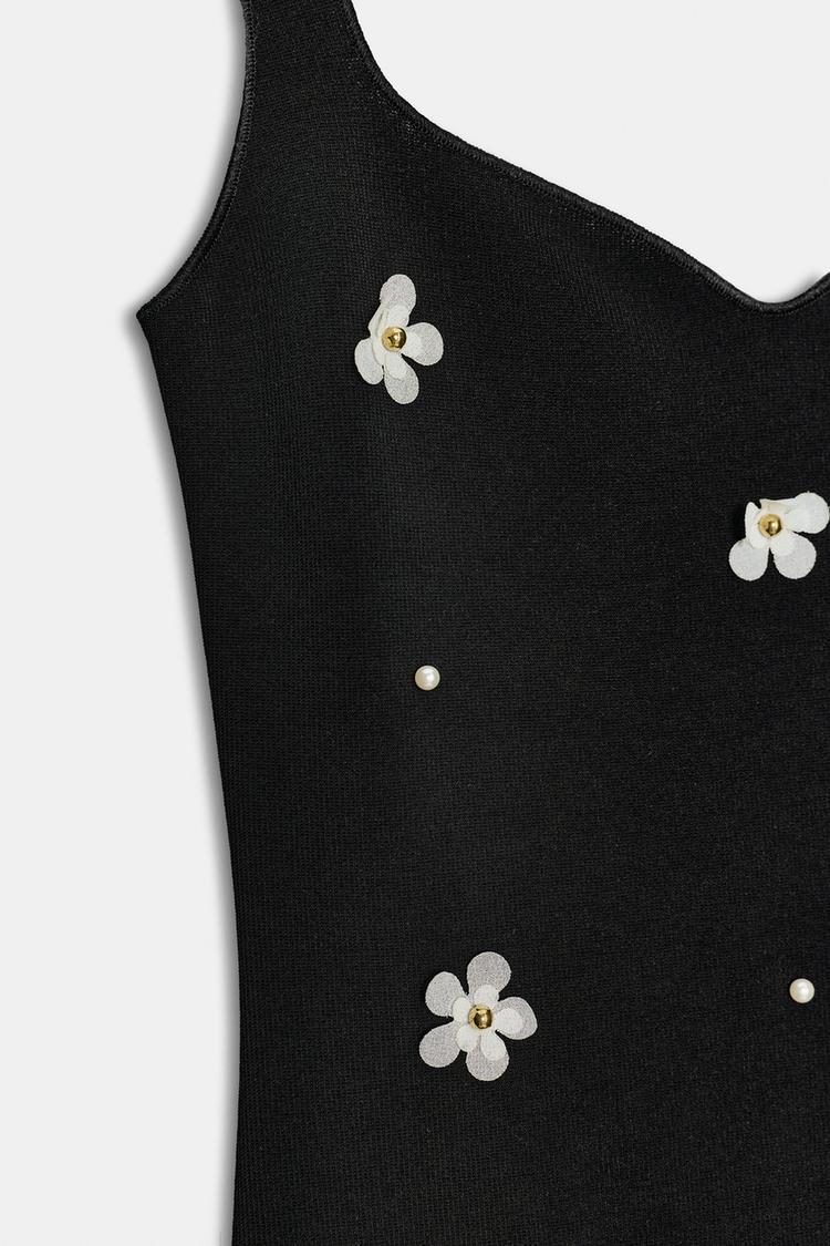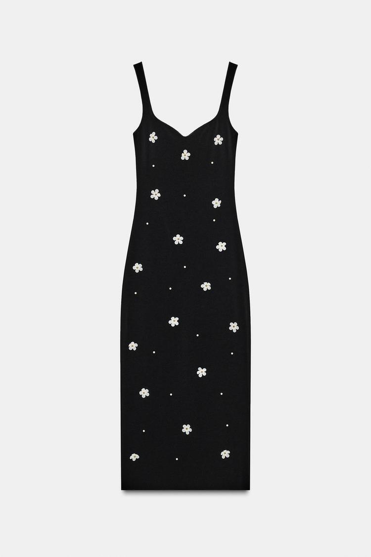 ZARA ЭЛАСТИЧНОЕ ПЛАТЬЕ МИДИ С ЦВЕТАМИ, ЧЕРНЫЙ