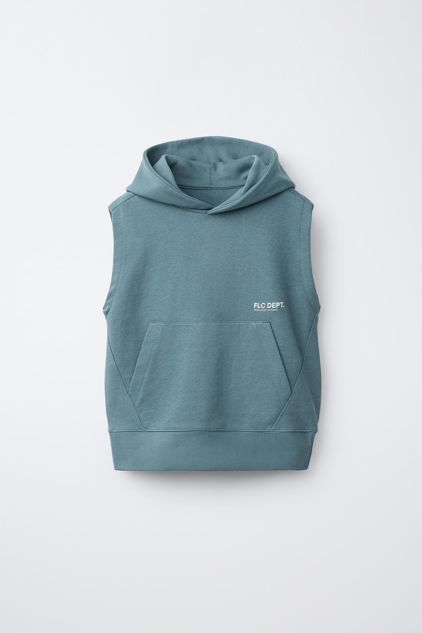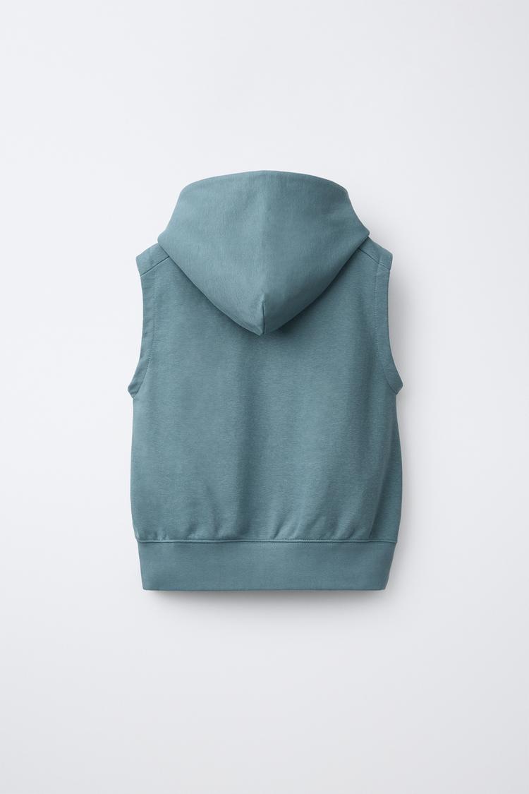 ZARA ФЛИСОВЫЙ ЖИЛЕТ С КАПЮШОНОМ И НАДПИСЬЮ, УТИНО-СИНИЙ