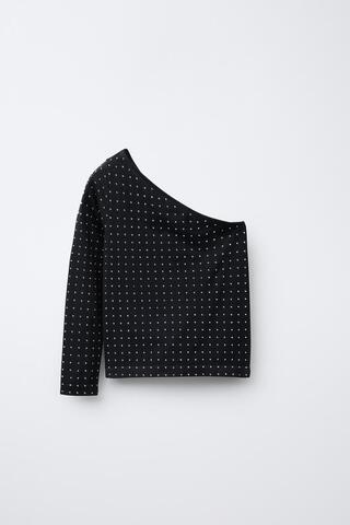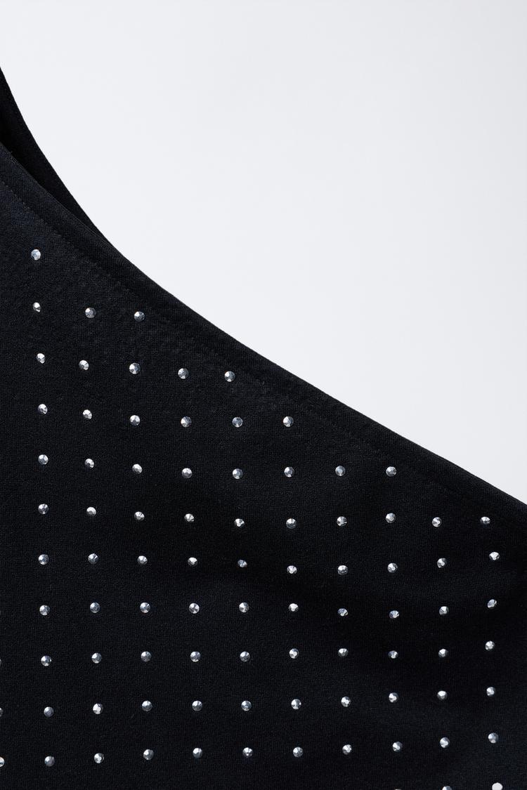 ZARA ФУТБОЛКА АСИММЕТРИЧНОГО КРОЯ БЕСШОВНАЯ СО СТРАЗАМИ, ЧЕРНЫЙ