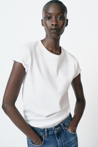 ZARA ФУТБОЛКА INTERLOCK С КОРОТКИМ РУКАВОМ, БЕЛЫЙ
