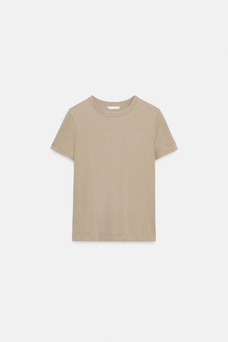 ZARA ФУТБОЛКА INTERLOCK С КОРОТКИМ РУКАВОМ, БЕЖЕВЫЙ