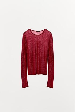 Футболка из 100% шерстяной пряжи. Круглый вырез и длинные рукава.
