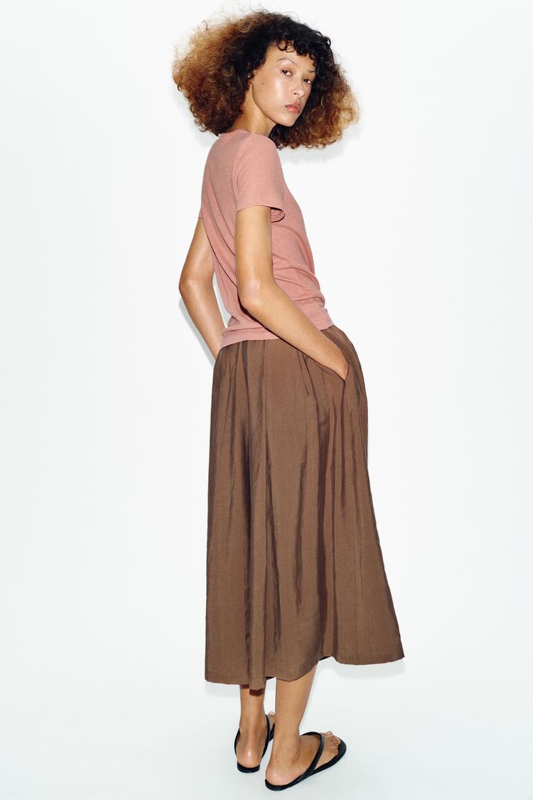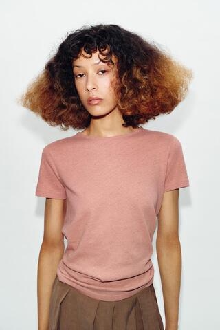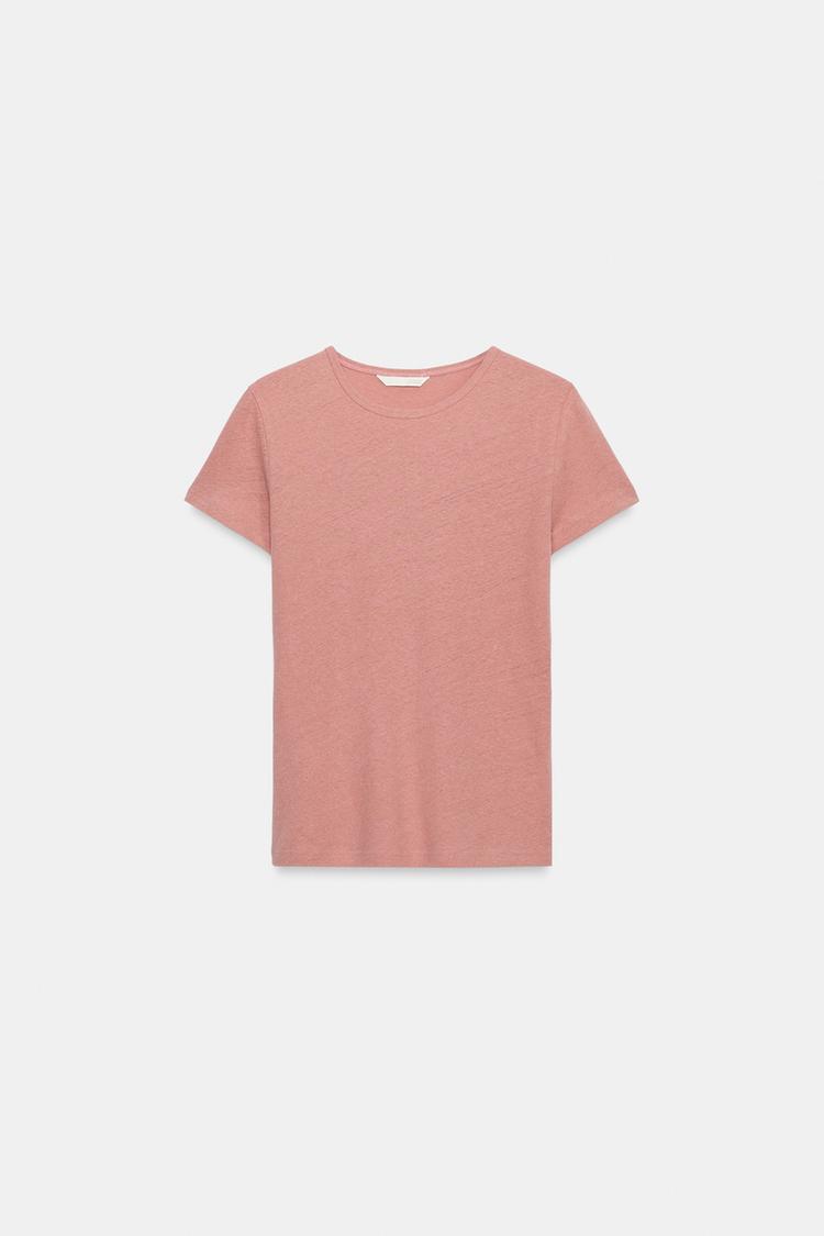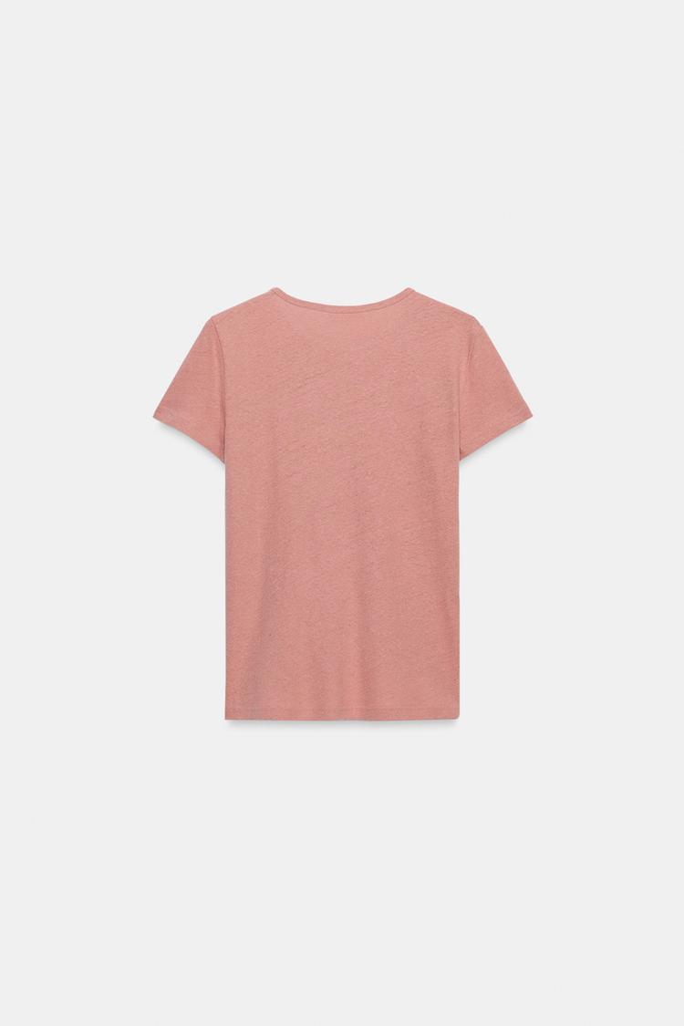 ZARA ФУТБОЛКА ИЗ ХЛОПКА И ЛЬНА С КОРОТКИМИ РУКАВАМИ, ЦВЕТ РОЗОВОГО МЕЛА