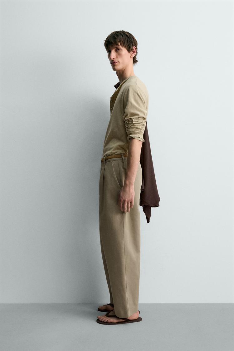 ZARA ФУТБОЛКА ИЗ ХЛОПКА И ЛЬНА С ВОРОТНИКОМ НА ПУГОВИЦАХ, ТЕМНО-БЕЖЕВЫЙ