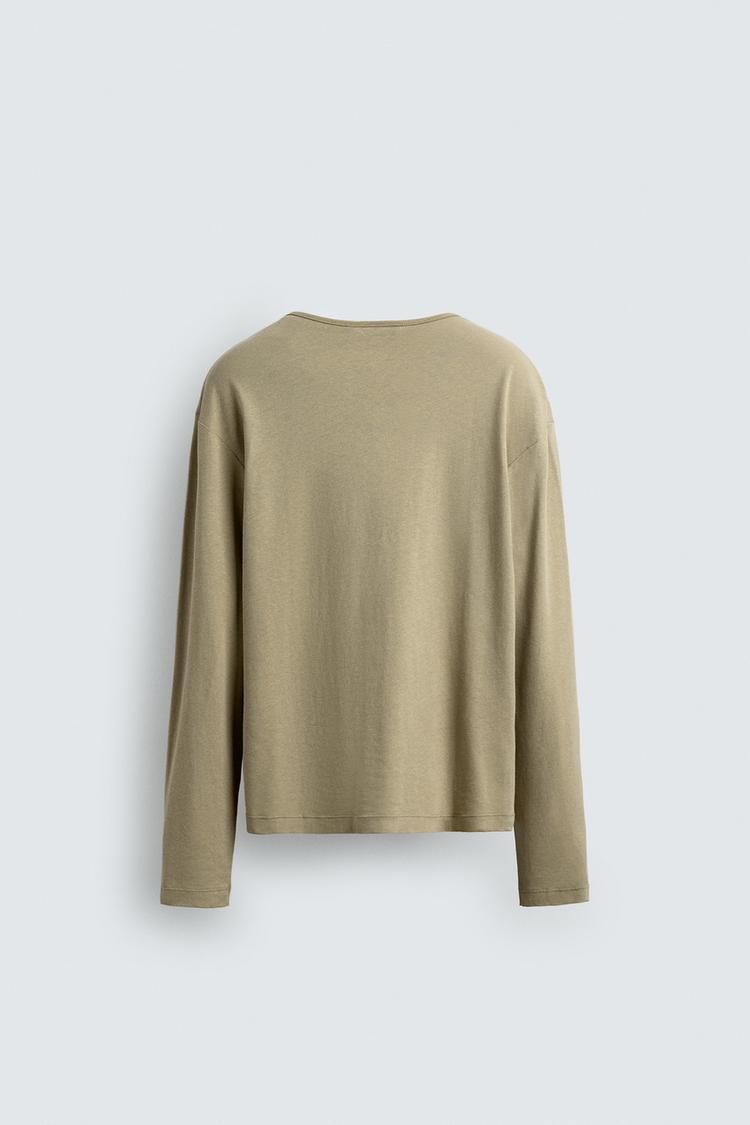 Футболка классического кроя из смеси хлопка и льна. Круглый вырез с застежкой на пуговицы спереди. Длинные рукава.