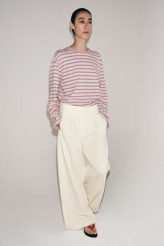 Футболка из смеси хлопка и 30% льна. Круглый вырез и длинные рукава. Прямой низ.
