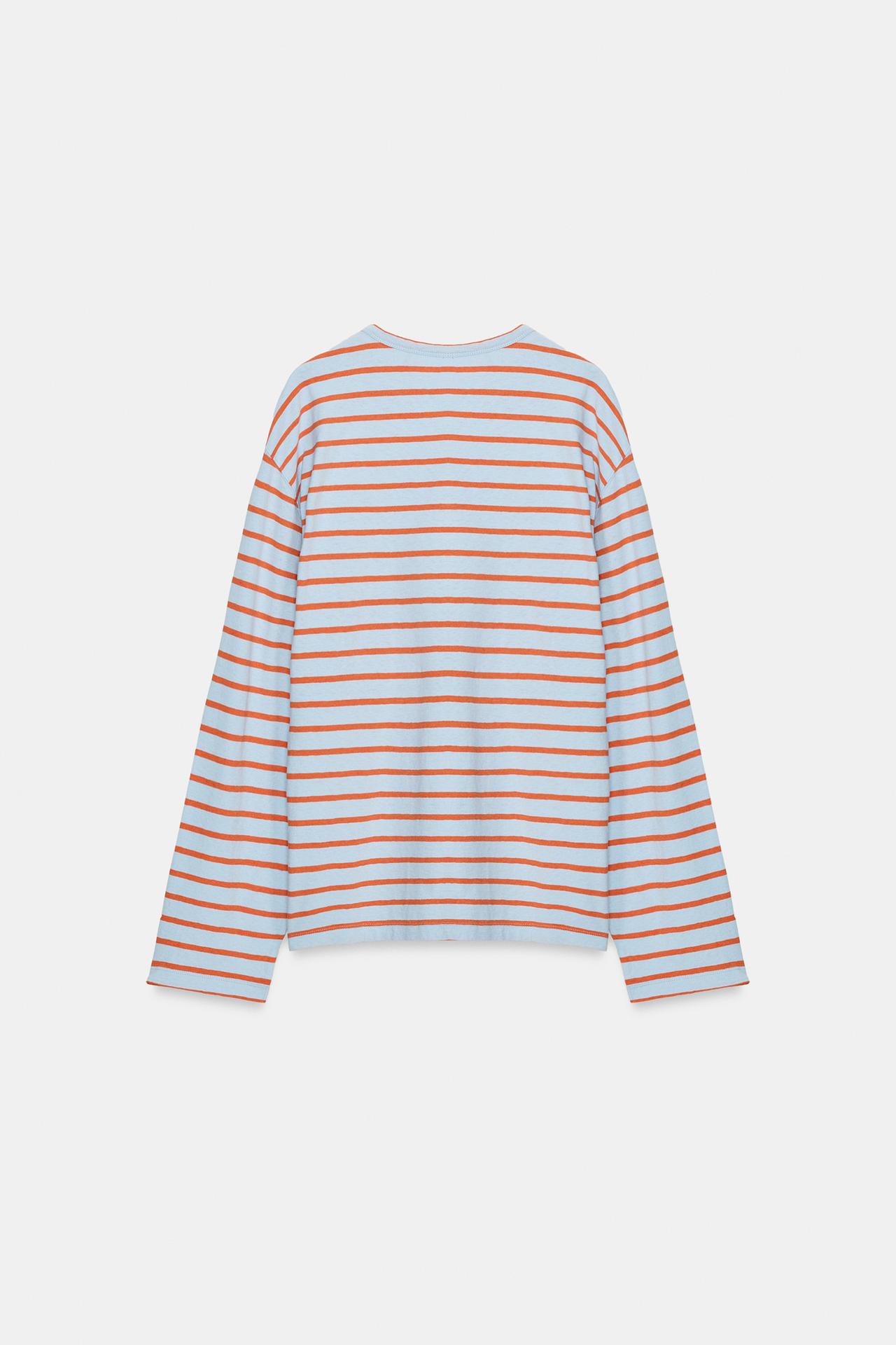ZARA ФУТБОЛКА ИЗ ХЛОПКА И ЛЬНА В ПОЛОСКУ, ПАСТЕЛЬНО-СИНИЙ