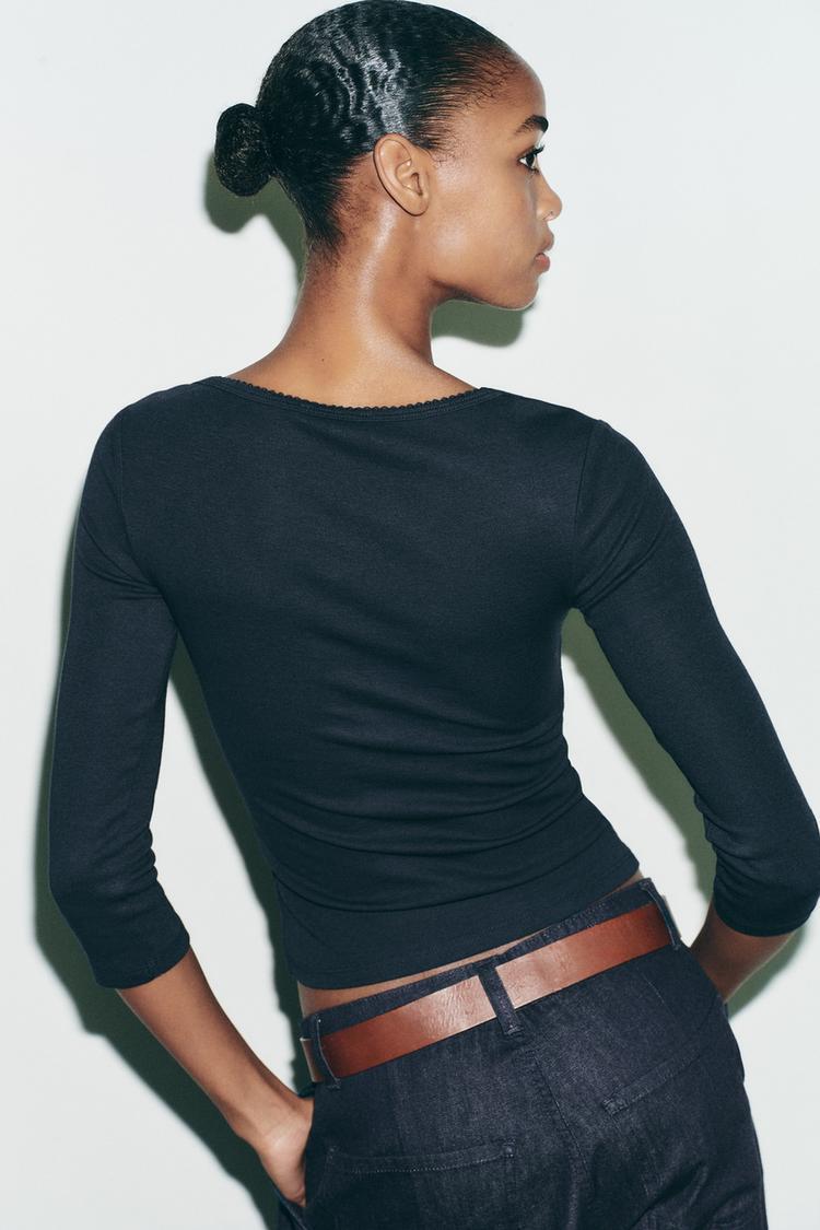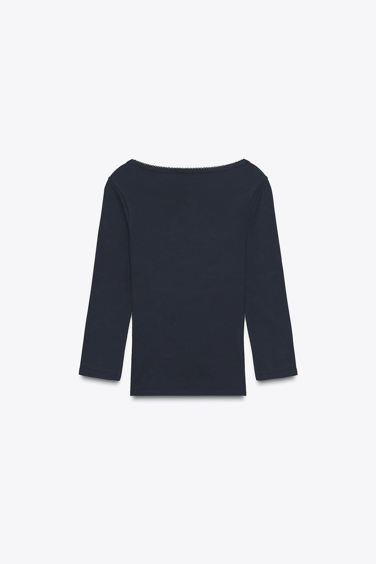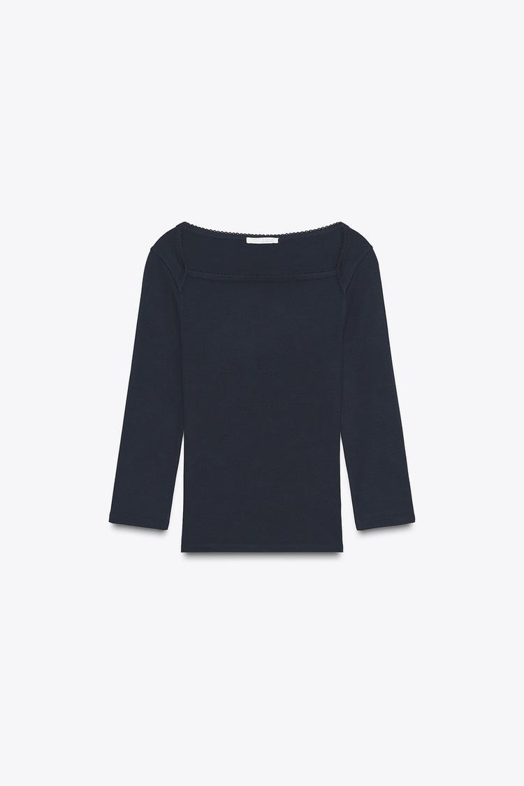 Футболка из хлопка и модала. Квадратный вырез с отделкой в тон. Длинные рукава.