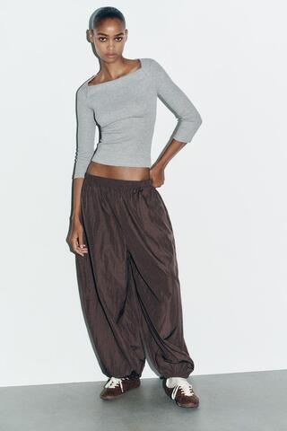 Футболка из хлопка и модала. Квадратный вырез с отделкой в тон. Длинные рукава.