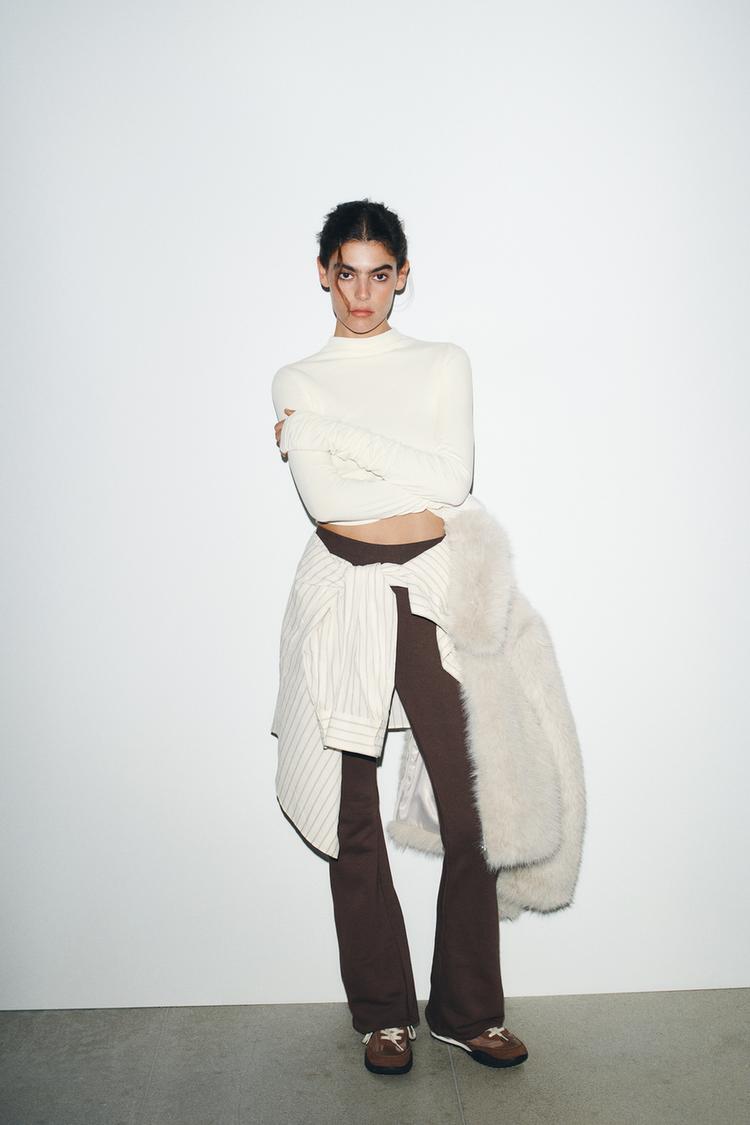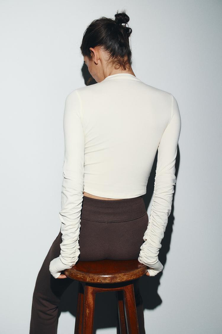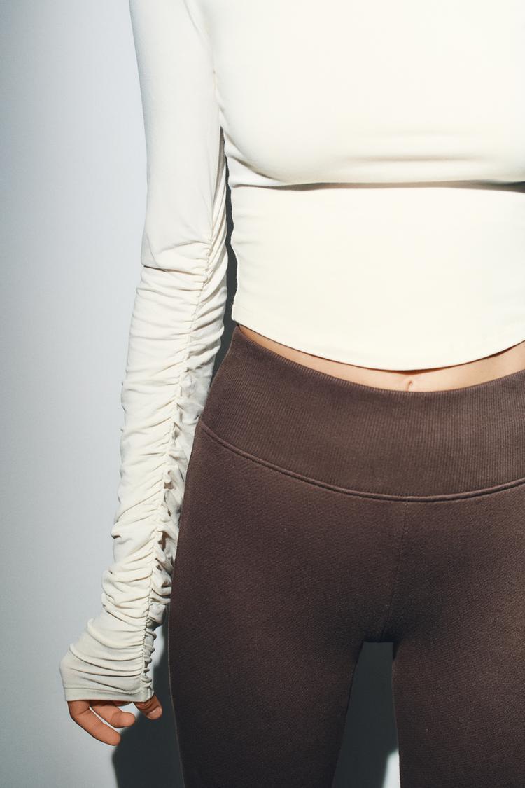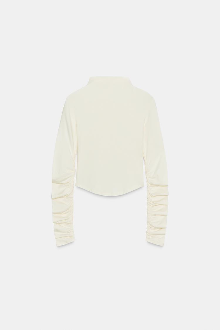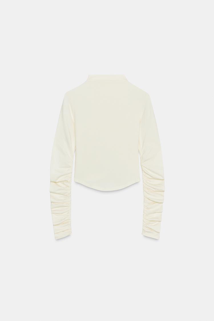 ZARA ФУТБОЛКА ИЗ ХЛОПКА И МОДАЛА СО СБОРКАМИ, ЭКРЮ