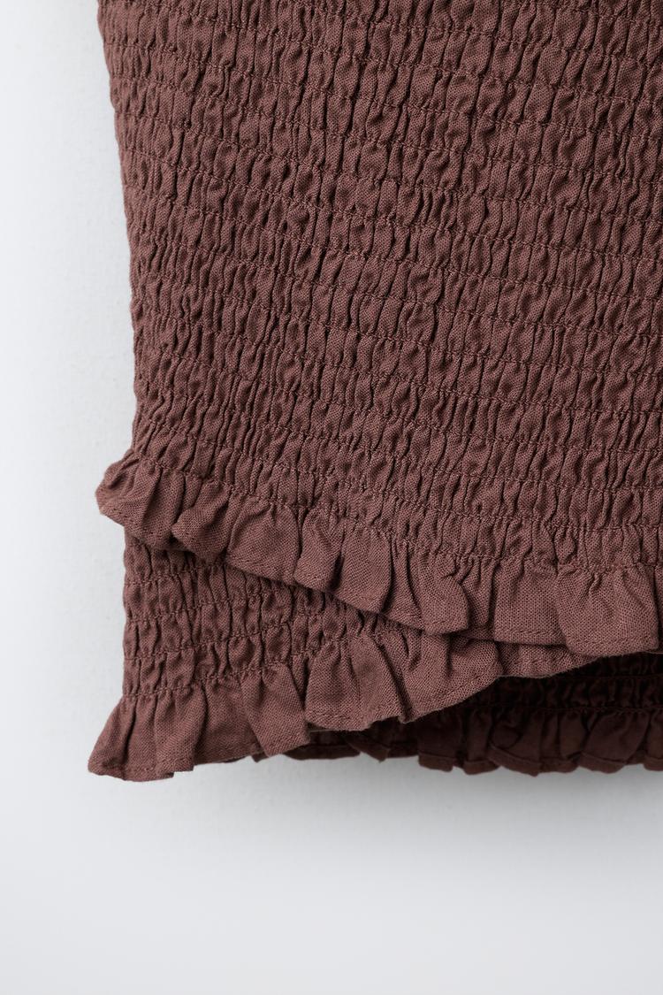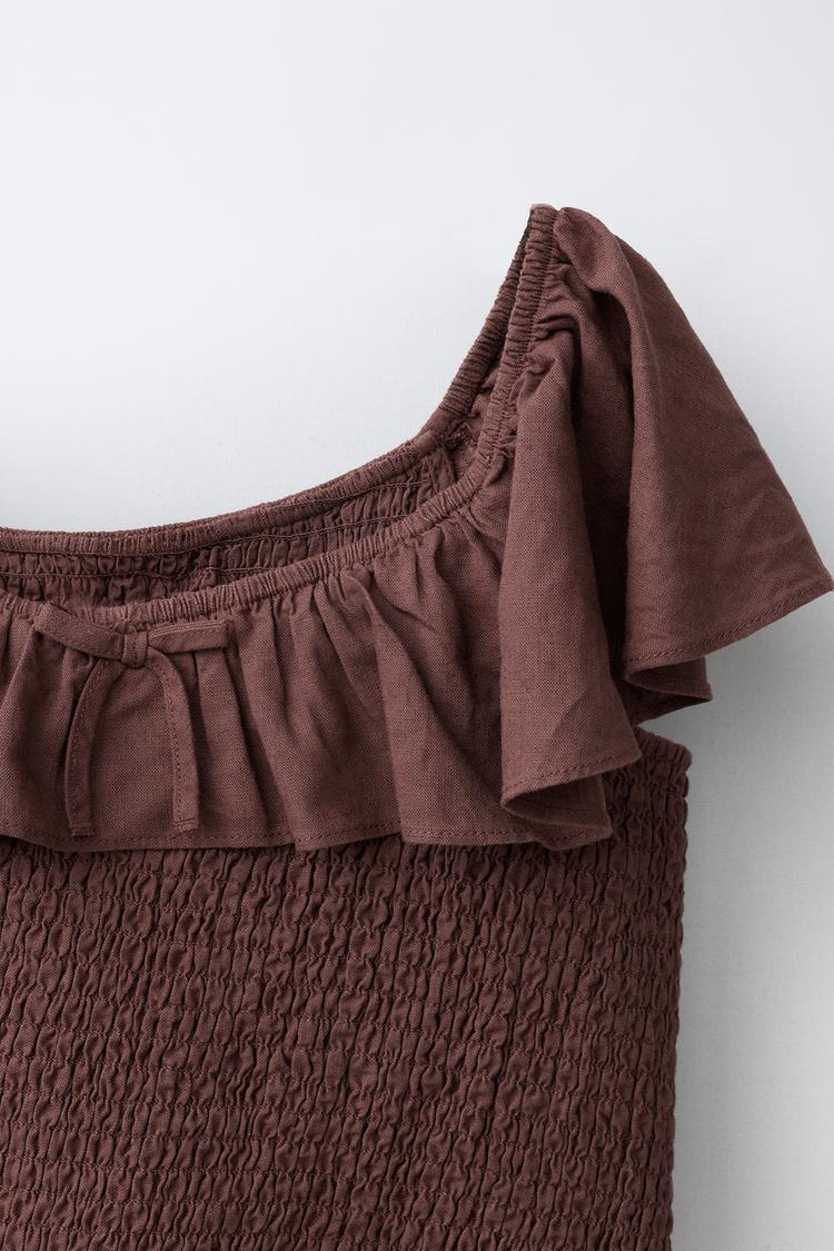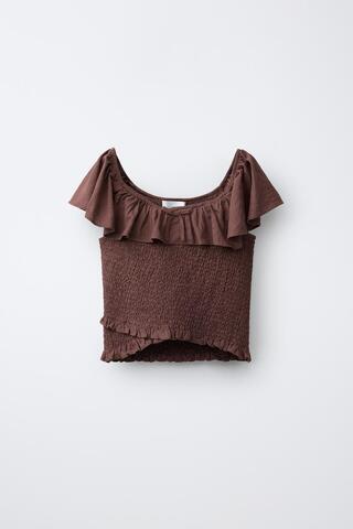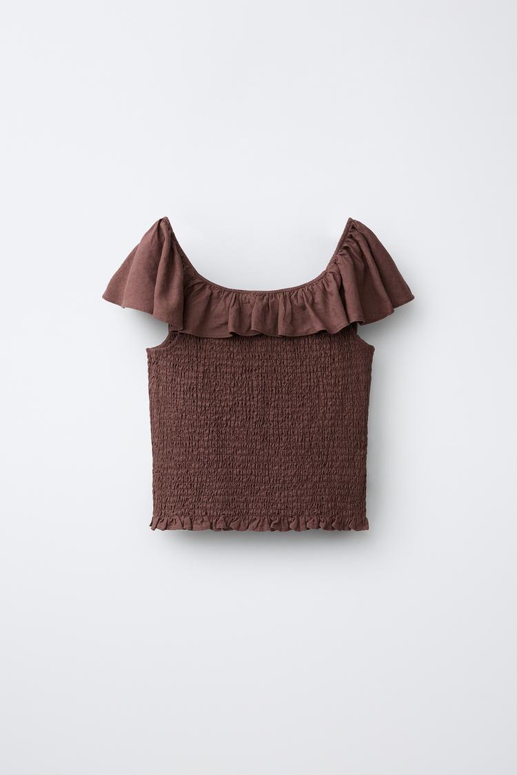 ZARA ФУТБОЛКА ИЗ ЛЬНА С УЗОРОМ «СОТЫ», КОРИЧНЕВЫЙ