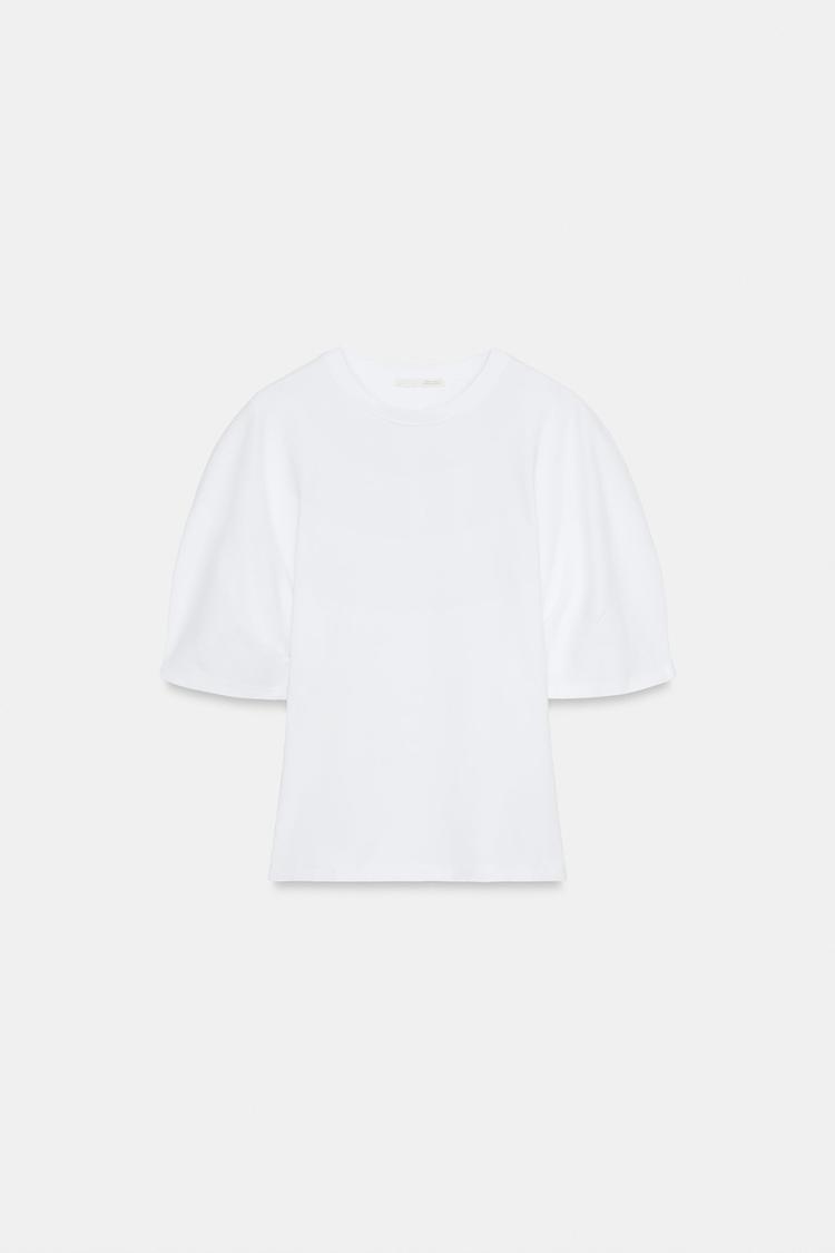 Футболка из 100% компактного хлопка. Круглый вырез и короткие пышные рукава. Прямой низ.