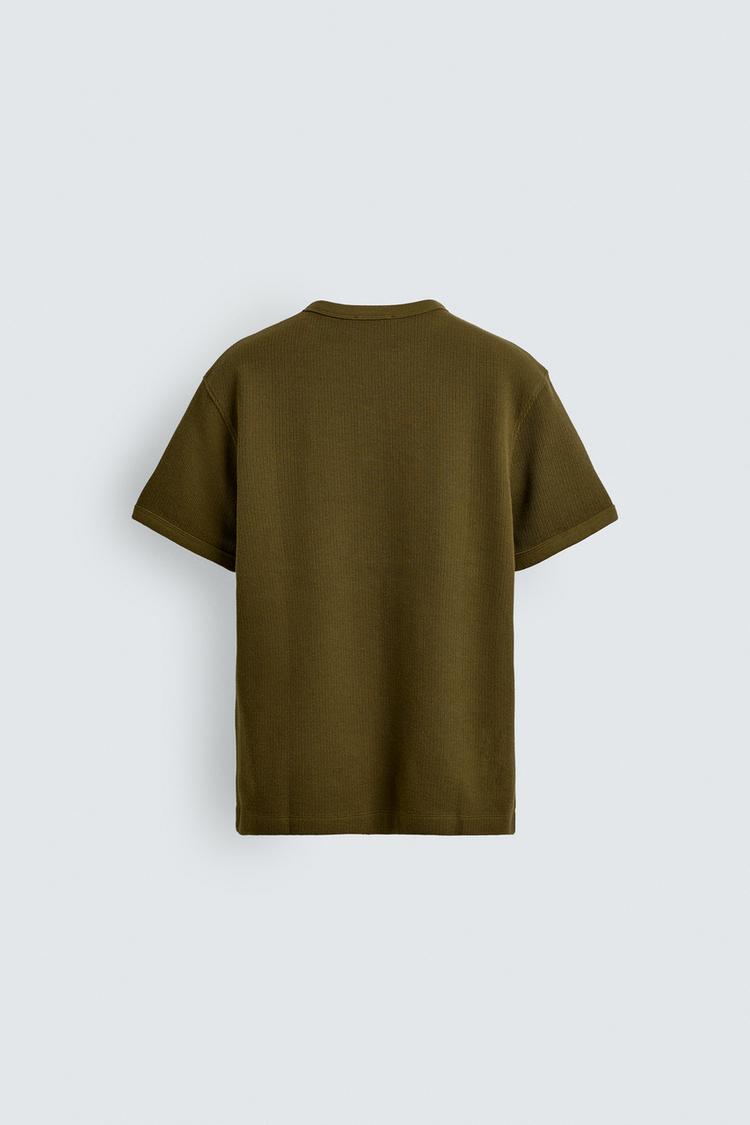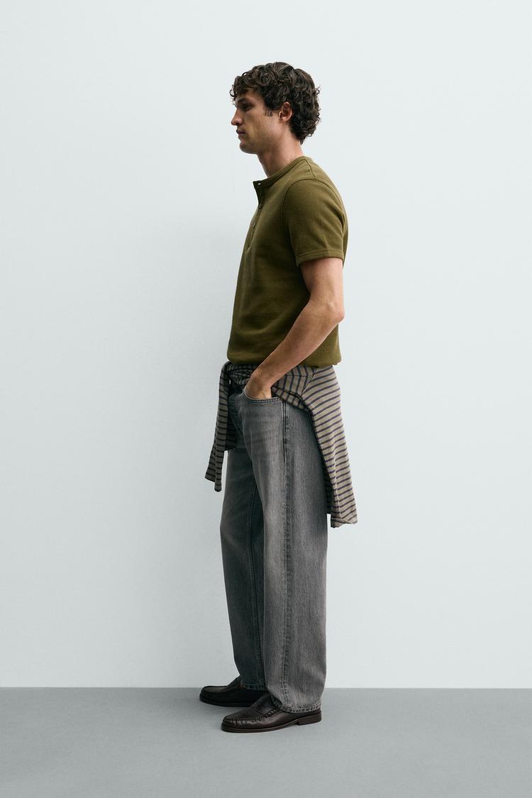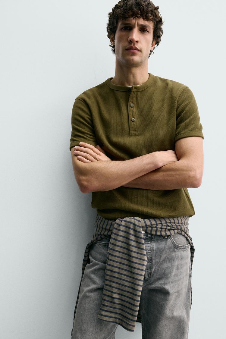 ZARA ФУТБОЛКА ИЗ РЕЛЬЕФНОЙ ТКАНИ С ВОРОТНИКОМ НА ПУГОВИЦАХ, ХАКИ