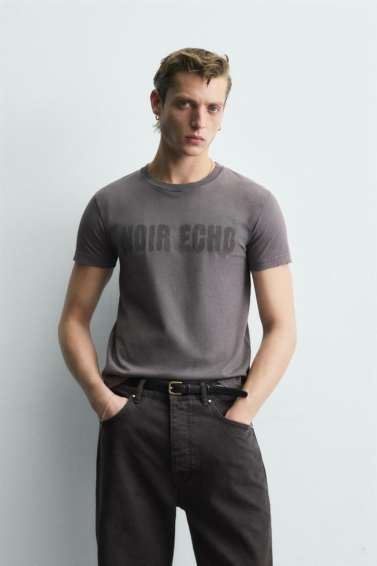 ZARA ФУТБОЛКА КРОП С НАДПИСЬЮ И ЭФФЕКТОМ ПОТЕРТОСТИ, СЕРЫЙ/КОРИЧНЕВЫЙ