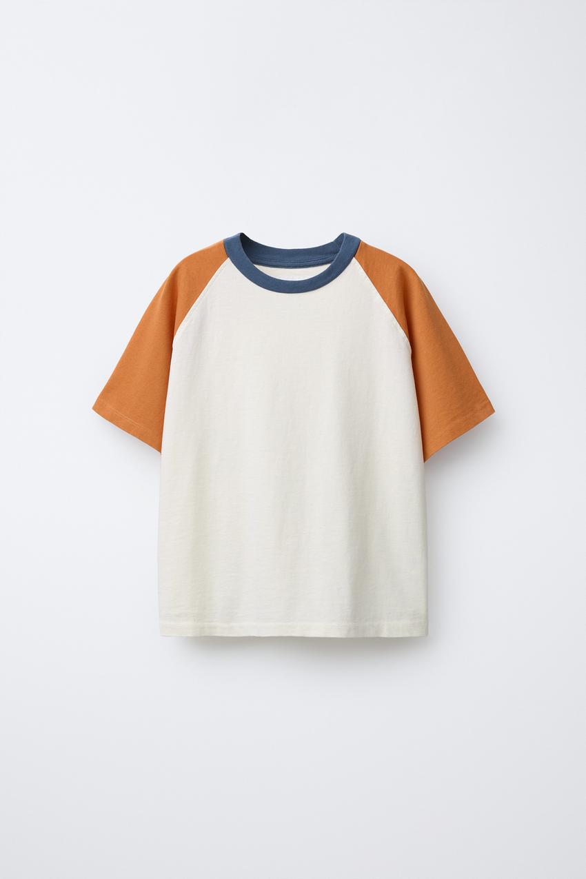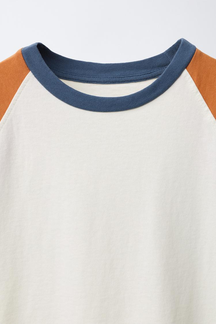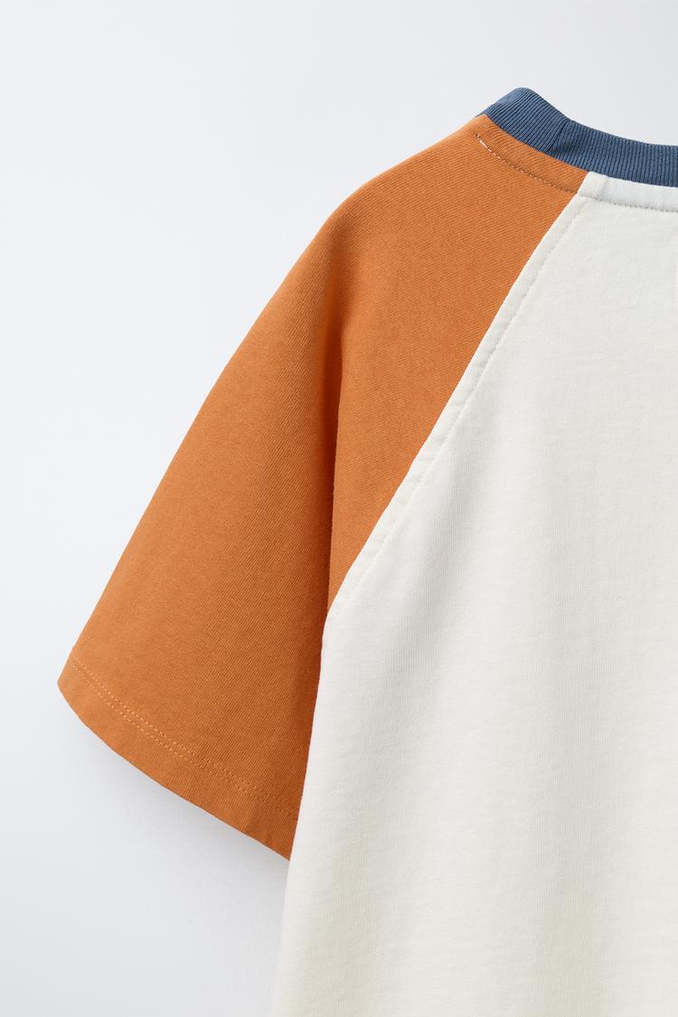 Футболка с круглым вырезом и короткими рукавами реглан контрастного цвета.