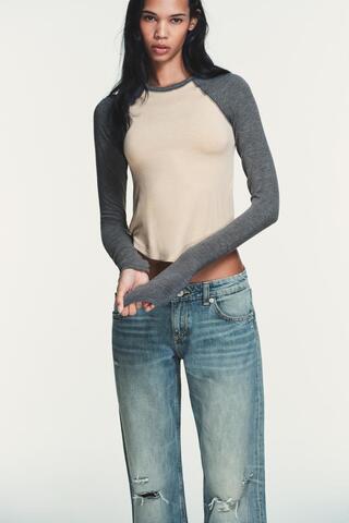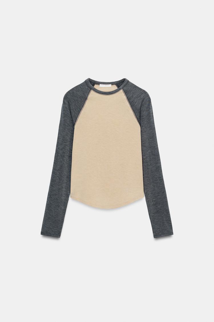 ZARA ФУТБОЛКА РЕГЛАН С КОНТРАСТНЫМИ ДЕТАЛЯМИ, СЕРЫЙ