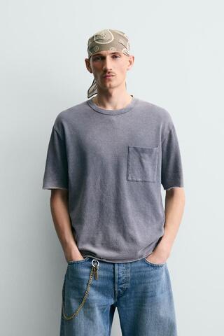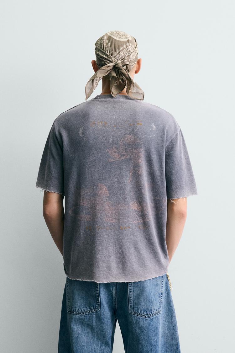 ZARA ФУТБОЛКА RELAXED FIT С ЭФФЕКТОМ ПОТЕРТОСТИ, ЛИНЯЛЫЙ СИНИЙ