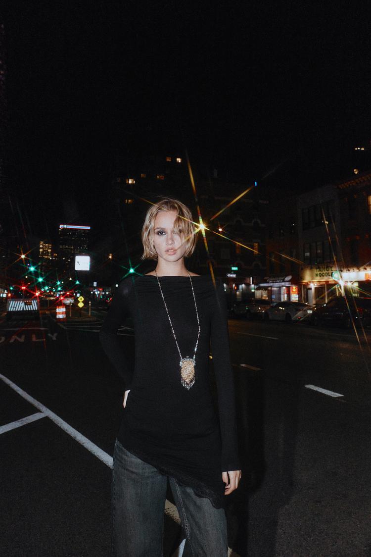 ZARA ФУТБОЛКА С АСИММЕТРИЧНЫМ НИЗОМ И КРУЖЕВОМ, ЧЕРНЫЙ
