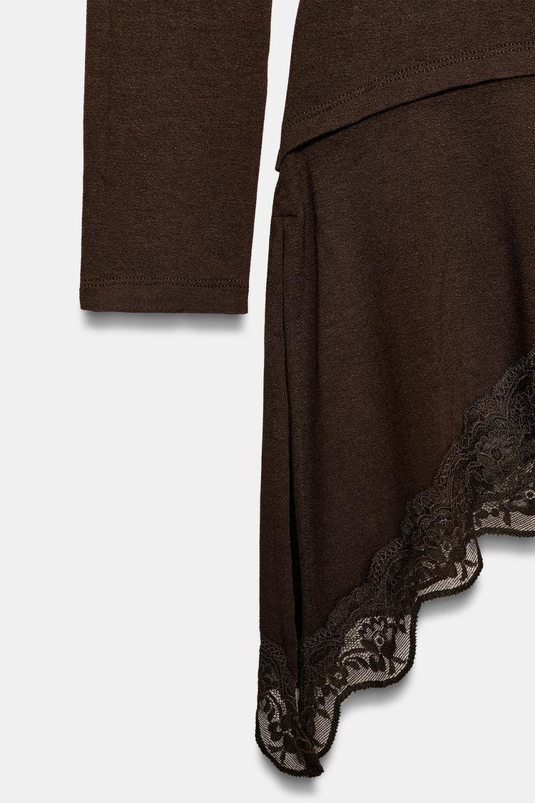 ZARA ФУТБОЛКА С АСИММЕТРИЧНЫМ НИЗОМ И КРУЖЕВОМ, ШОКОЛАДНЫЙ