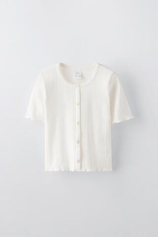 ZARA ФУТБОЛКА С АЖУРНЫМ УЗОРОМ И ПУГОВИЦАМИ, БЕЛЫЙ