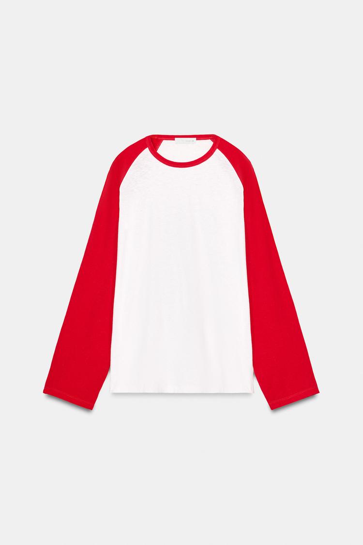 ZARA ФУТБОЛКА С ДЛИННЫМИ РУКАВАМИ И КОНТРАСТНЫМИ ЭЛЕМЕНТАМИ, БЕЛЫЙ/КРАСНЫЙ