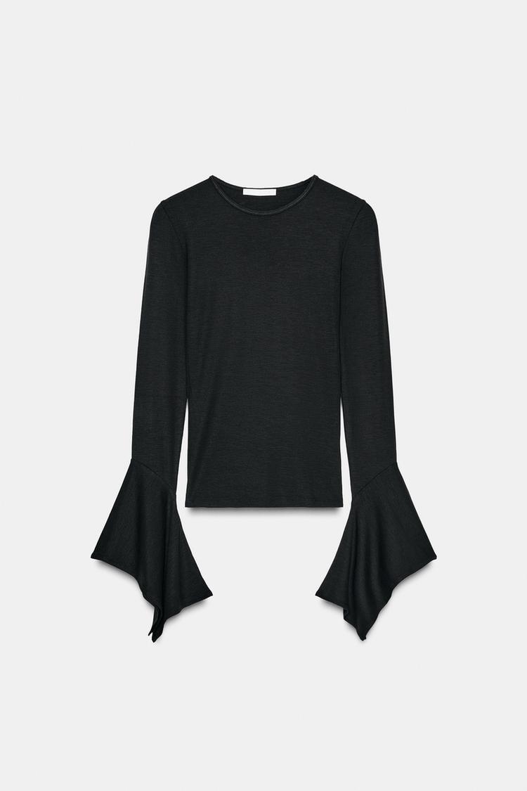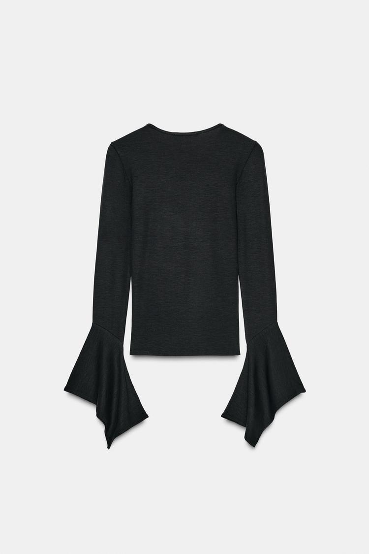ZARA ФУТБОЛКА С ДЛИННЫМИ РУКАВАМИ И ВОЛАНОМ, ЧЕРНЫЙ