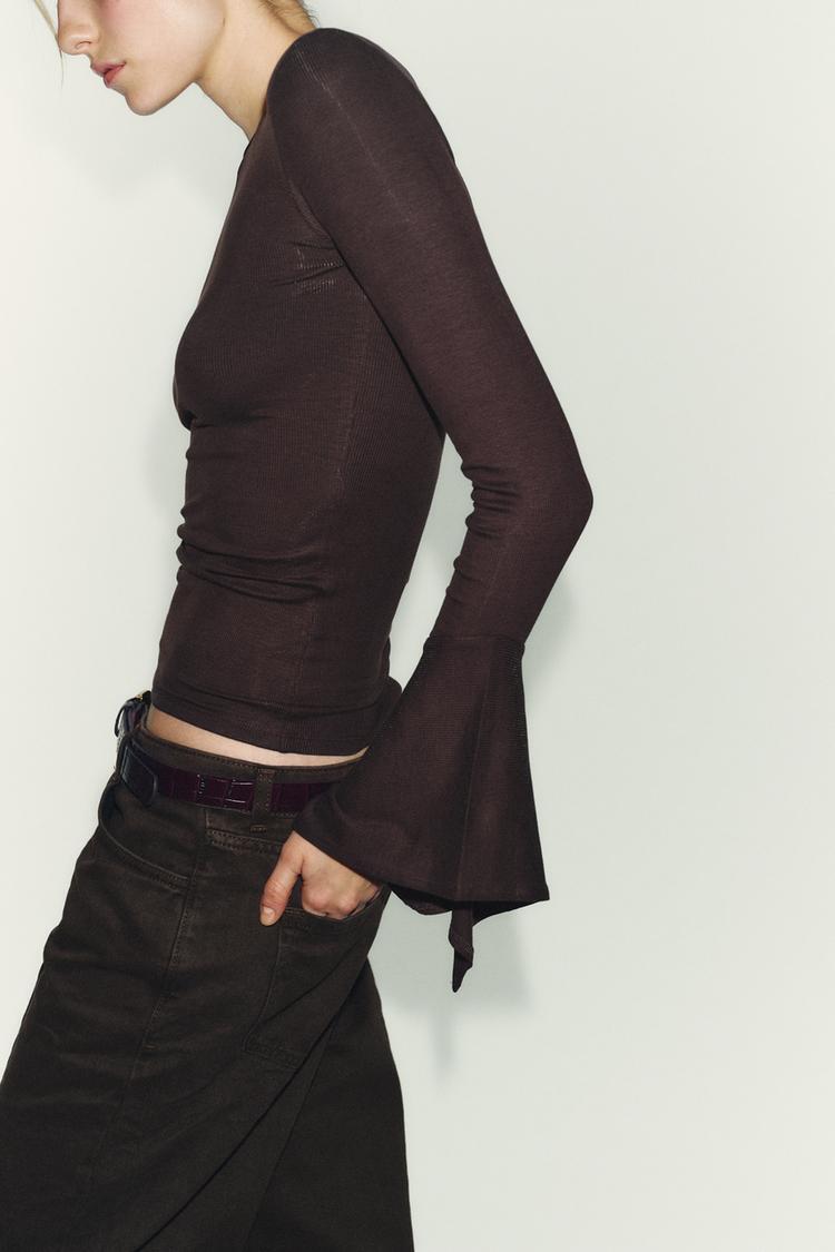 ZARA ФУТБОЛКА С ДЛИННЫМИ РУКАВАМИ И ВОЛАНОМ, ШОКОЛАДНЫЙ