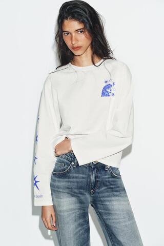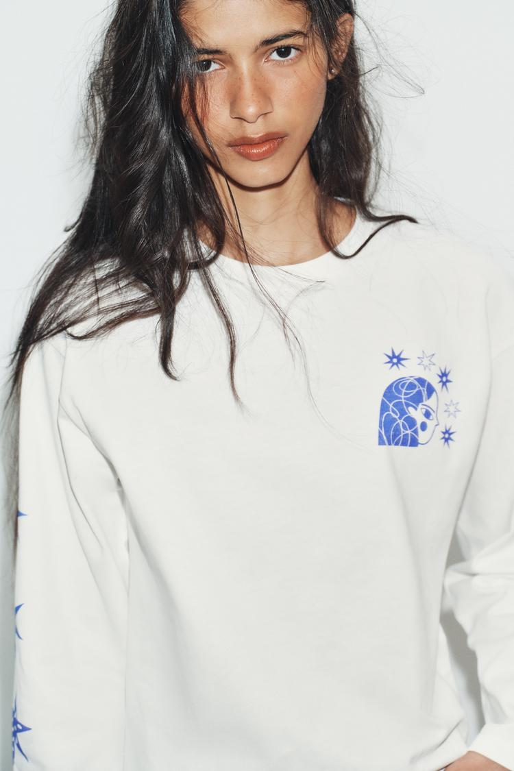 ZARA ФУТБОЛКА С ДЛИННЫМИ РУКАВАМИ С ПРИНТОМ AGUSTINA SHUAN, БЕЛЫЙ