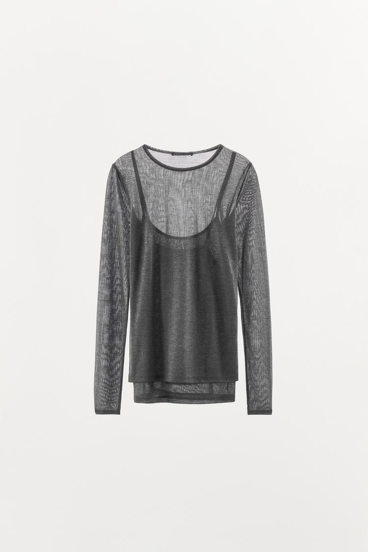 Футболка с круглым вырезом и длинными рукавами. Деталь в виде внутренней футболки из той же ткани. Асимметричный низ.