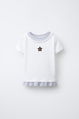 ZARA ФУТБОЛКА С ДВОЙНЫМ ВОРОТНИКОМ И ВЫШИТОЙ ЗВЕЗДОЙ, БЕЛЫЙ