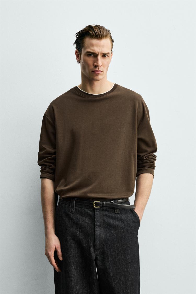 ZARA ФУТБОЛКА С ДВОЙНЫМИ КОНТРАСТНЫМИ ДЕТАЛЯМИ, КОРИЧНЕВЫЙ