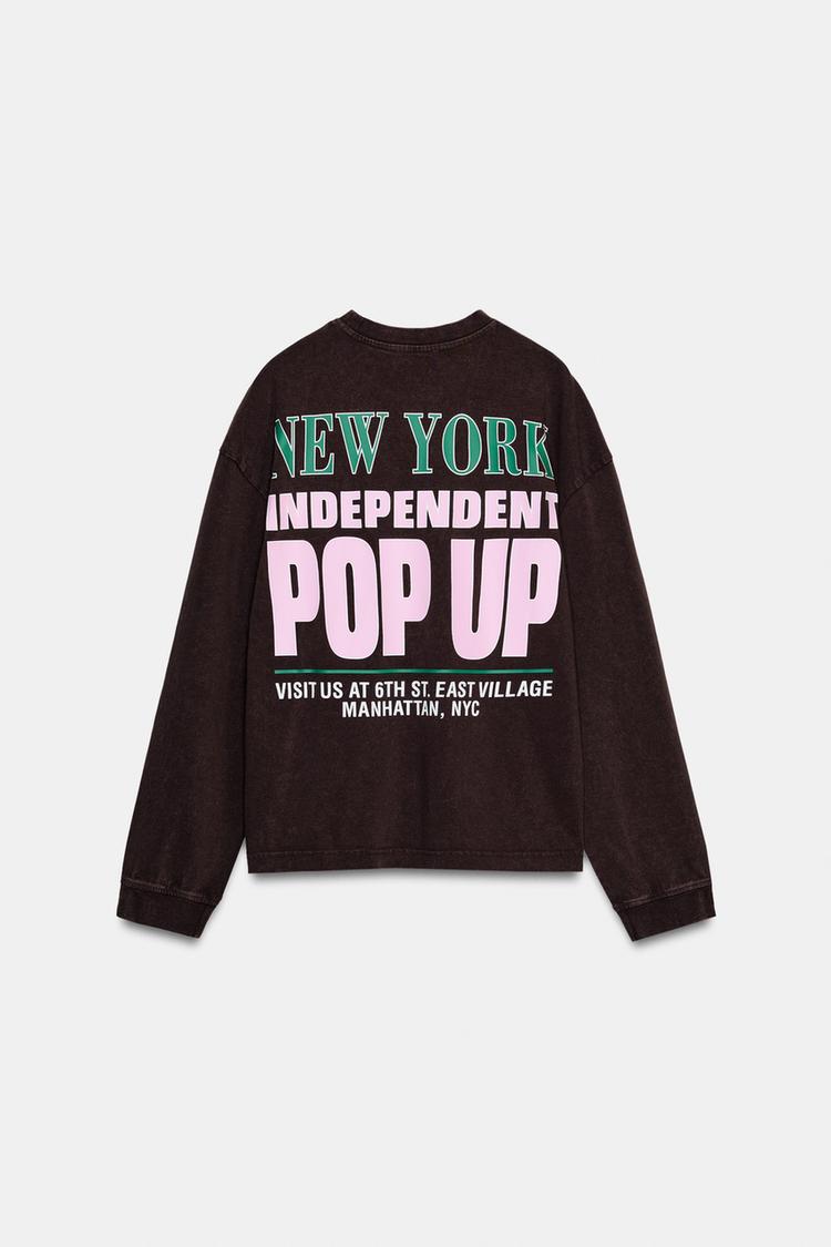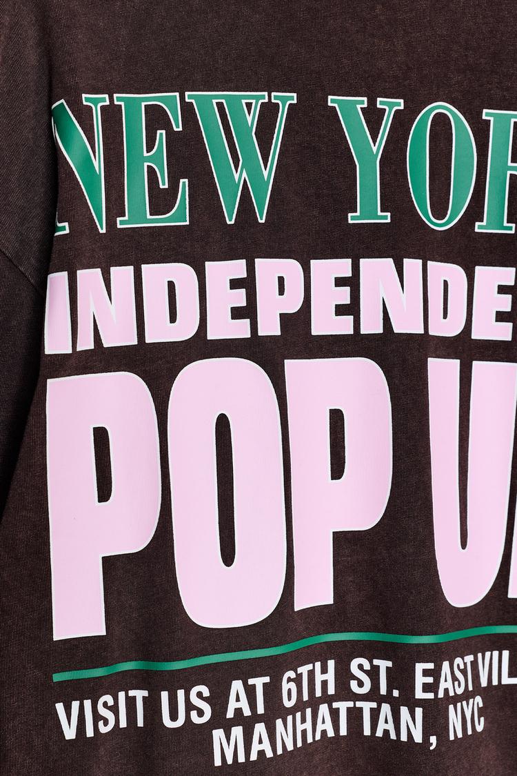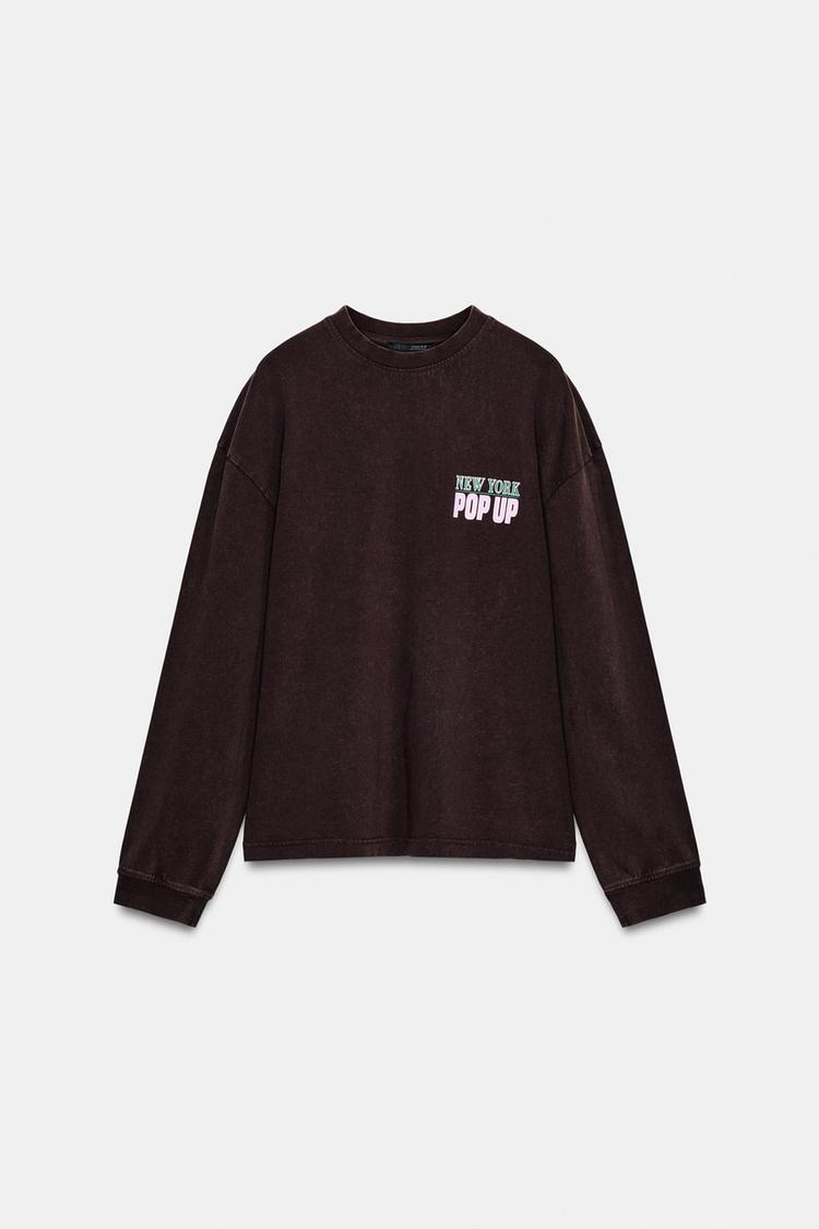 ZARA ФУТБОЛКА С ЭФФЕКТОМ ПОТЕРТОСТИ И КОНТРАСТНЫМ ТЕКСТОМ, КОРИЧНЕВЫЙ