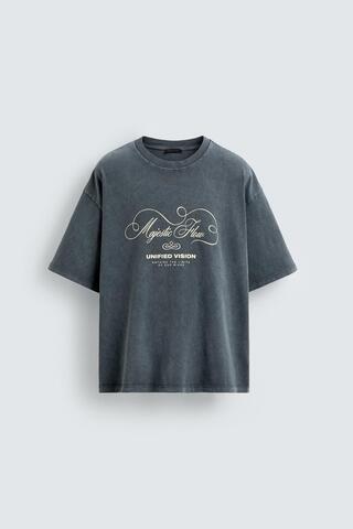 ZARA ФУТБОЛКА С ЭФФЕКТОМ ПОТЕРТОСТИ И НАДПИСЯМИ, СВЕТЛО-СЕРЫЙ