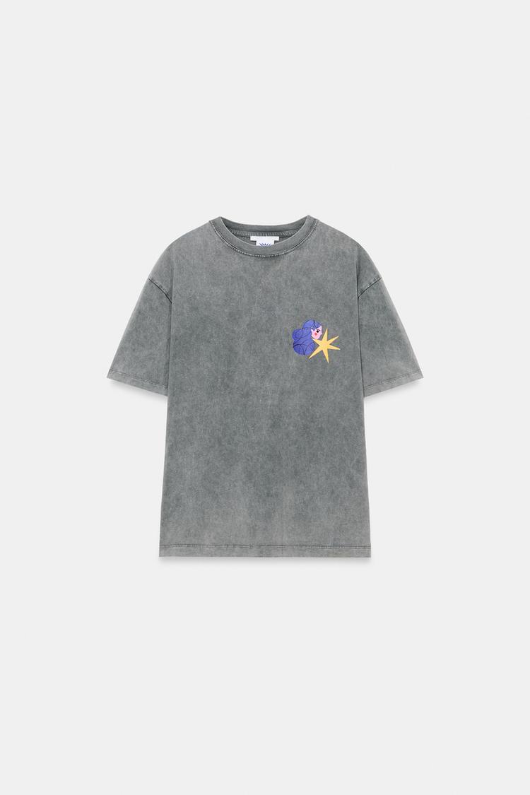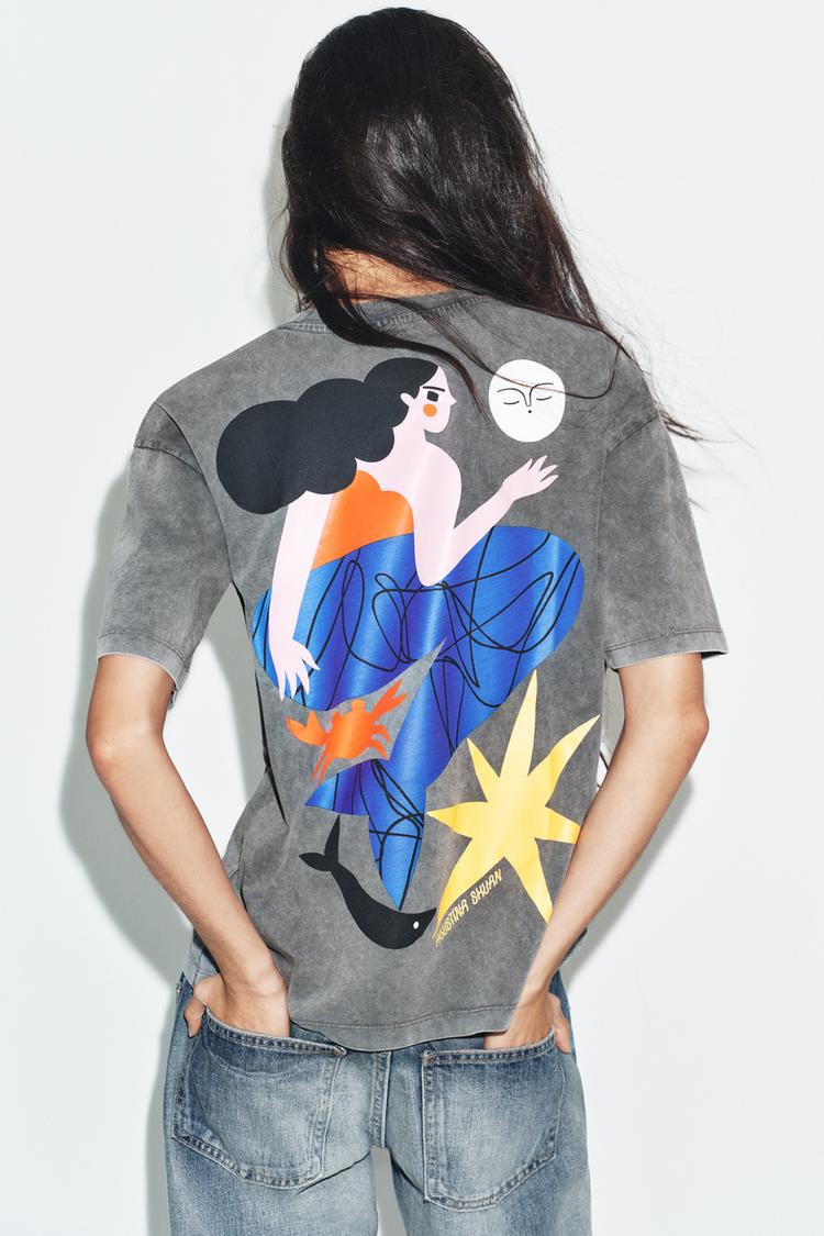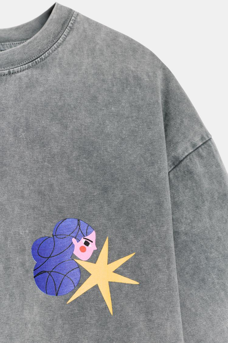 ZARA ФУТБОЛКА С ЭФФЕКТОМ ПОТЕРТОСТИ И ПРИНТОМ AGUSTINA SHUAN, СЕРЫЙ
