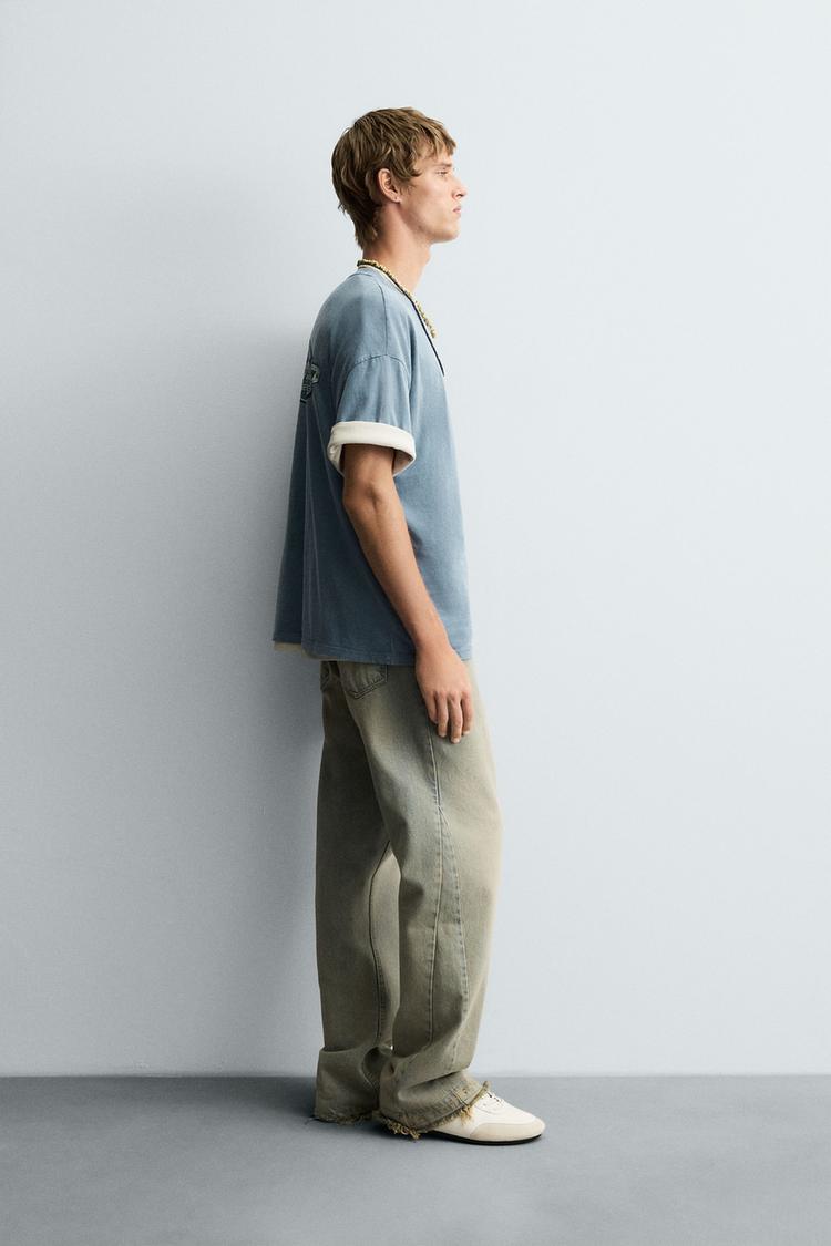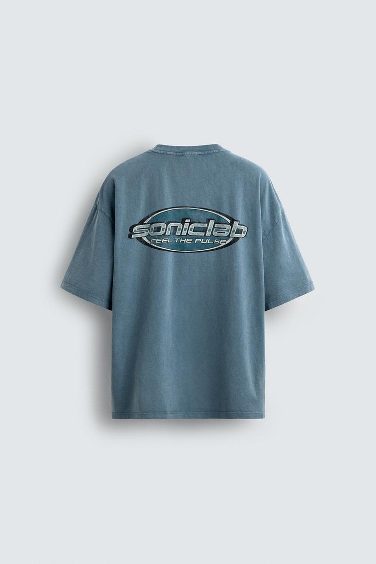 ZARA ФУТБОЛКА С ГРАФИЧЕСКИМ ПРИНТОМ И ЭФФЕКТОМ ПОТЕРТОСТИ, ЛИНЯЛЫЙ СИНИЙ
